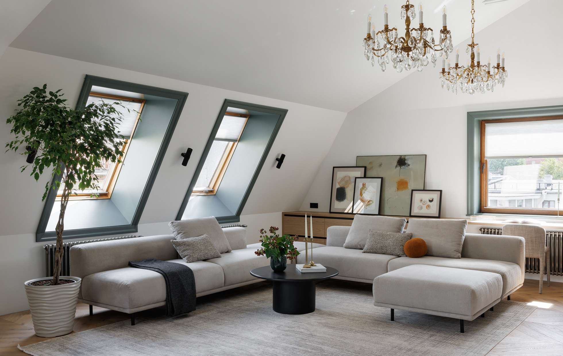 Большие окна мансарды дарят помещению обилие естественного света. Это ключевое преимущество, которое дизайнеры подчеркнули, выбрав светлую цветовую гамму. Такая комната становится идеальным местом для отдыха и встреч с друзьями.