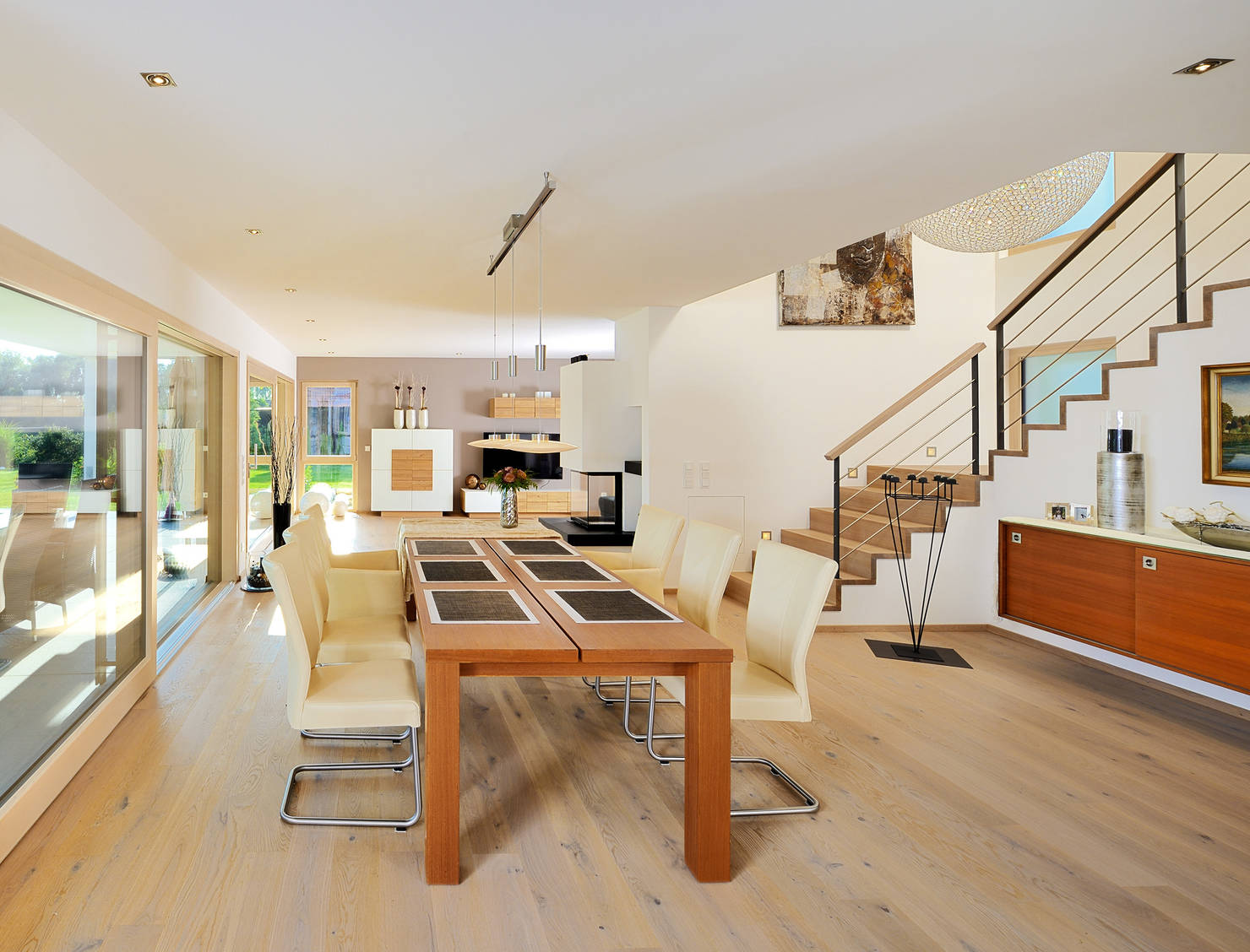 Столовая с дверьми-слайдерами в самой солнечной зоне дома
