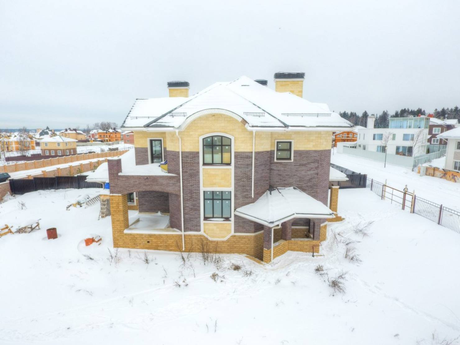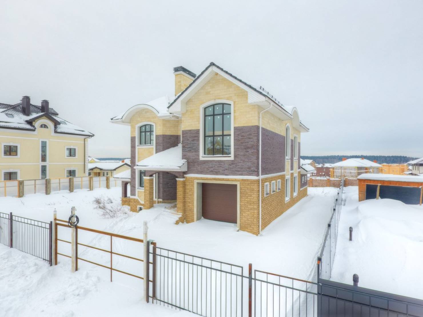 Архитекторы московской компании Vesco Construction разработали этот проект для современного загородного жилья в пригороде столицы. Дом привлекает внимание характерными для английского стиля элементами: массивным высоким цоколем, изящными арочными проемами и декоративной ковкой, которые создают ощущение солидности и респектабельности.