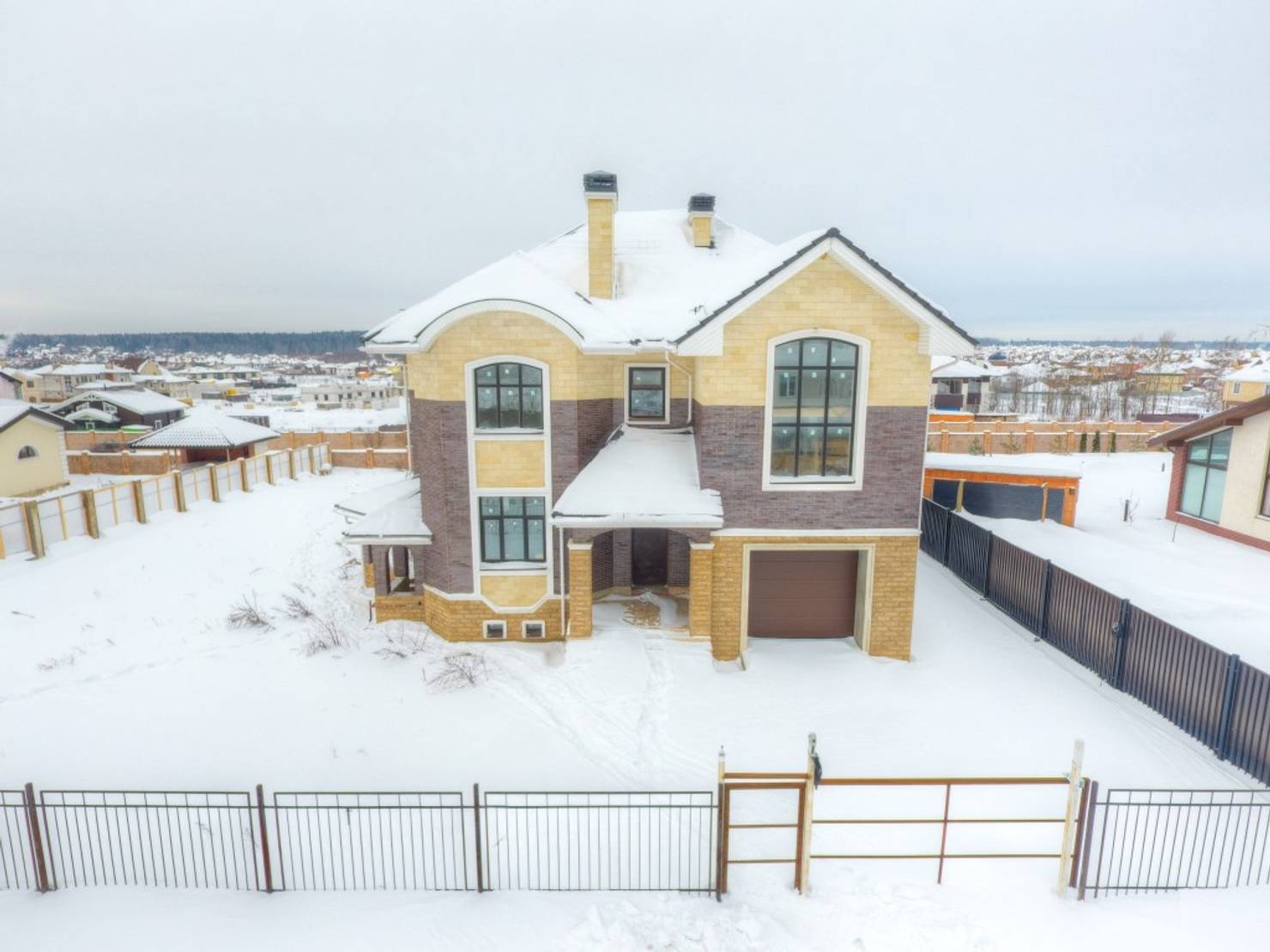 Площадь здания составляет 326.6 квадратных метров, из которых 183 кв. м отведено под жилые помещения. Проект включает четыре спальни, три санузла и гараж на одно автомобильное место. Конструктивная основа — кирпичный каркас с монолитными перекрытиями, а для отделки фасада архитекторы выбрали комбинацию облицовочного кирпича, декоративной штукатурки и натурального камня, что подчеркивает текстуру и глубину фасада.