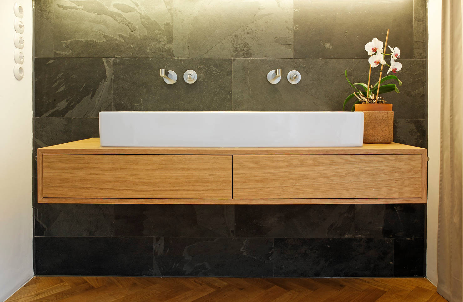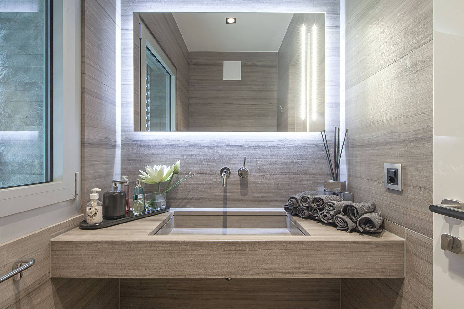 Правильный свет способен преобразить помещение. Откажитесь от одной центральной люстры в пользу многослойного подхода. Комбинируйте настенные бра для мягкого фонового света, точечные потолочные светильники для общей освещённости и обязательно подсветите зеркало — это сделает утренние процедуры комфортнее.