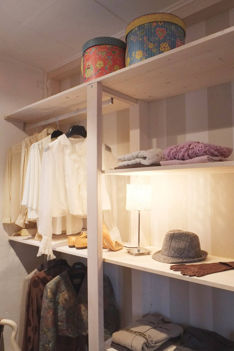 Не забывайте использовать высоту комнаты по максимуму. Разместите штанги для вешалок на разных уровнях, установите высокие стеллажи до потолка. Это позволит чётко зонировать пространство: например, верхние уровни отдать под долгосрочное хранение или вещи нечастого использования, а средние и нижние — под повседневный гардероб. Когда у каждой категории вещей есть своё постоянное место, собирать образы становится легко и приятно.