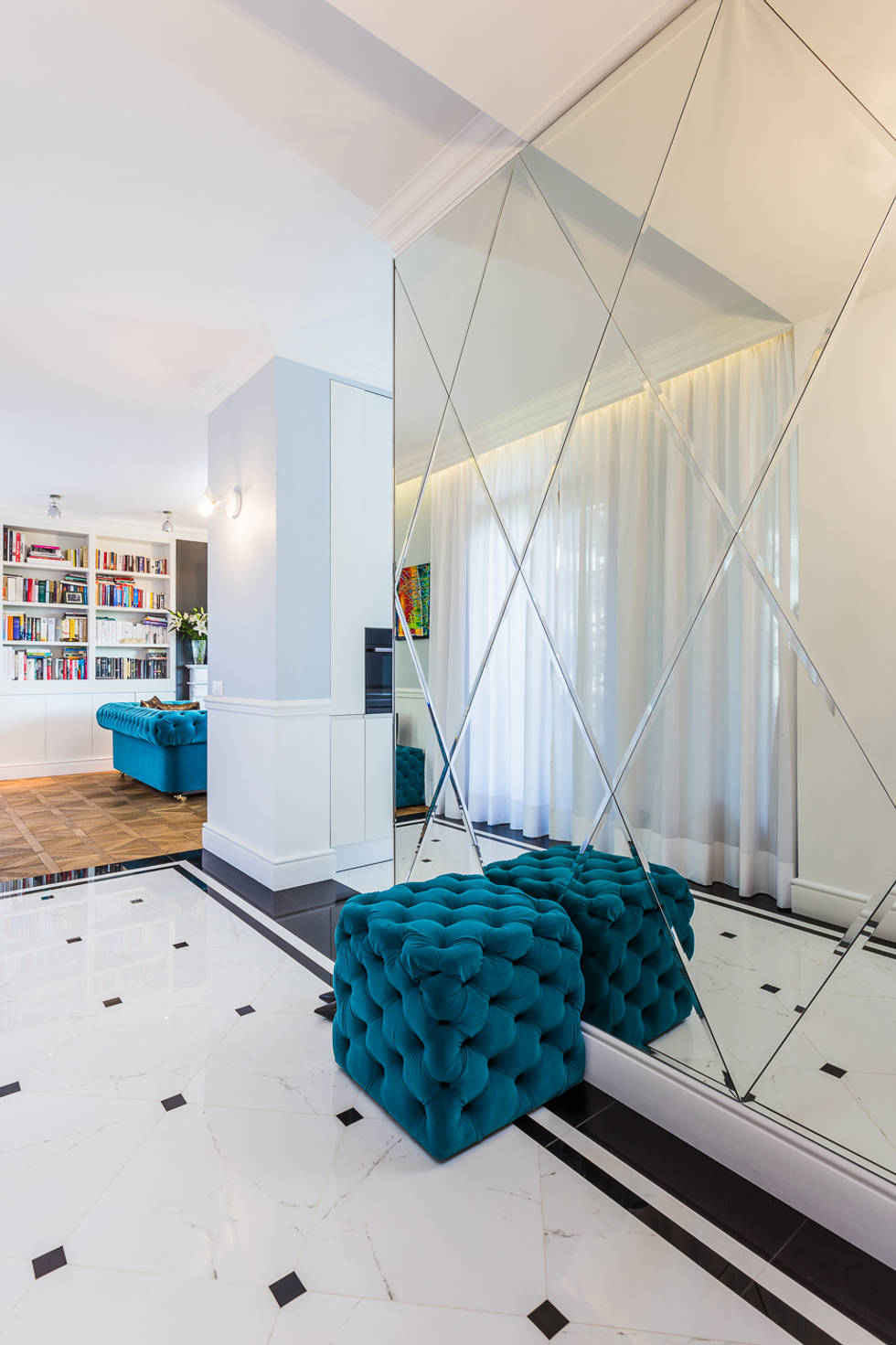 Использование зеркал или зеркальных панелей на стенах — классический приём для преображения пространства. Они отражают свет и интерьер, визуально расширяя границы комнаты, делая её светлее и воздушнее. Это отличное решение для небольших или тёмных помещений.