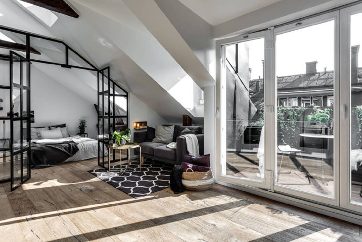 Цветовая гамма интерьера построена на сочетании черного, серого и натуральных оттенков древесины. Стены и мебель выдержаны в спокойной серо-черной гамме, которая служит идеальным фоном. На полу уложен бледный серо-коричневый паркет, создающий ощущение тепла и уюта. Интересный контрастный акцент — темно-коричневые потолочные балки, которые подчеркивают мансардный характер квартиры. Общая площадь жилья составляет около 37 квадратных метров, и оно расположено на мансардном этаже, что добавляет помещению особого шарма и света. Отдельным преимуществом является наличие собственного балкона.