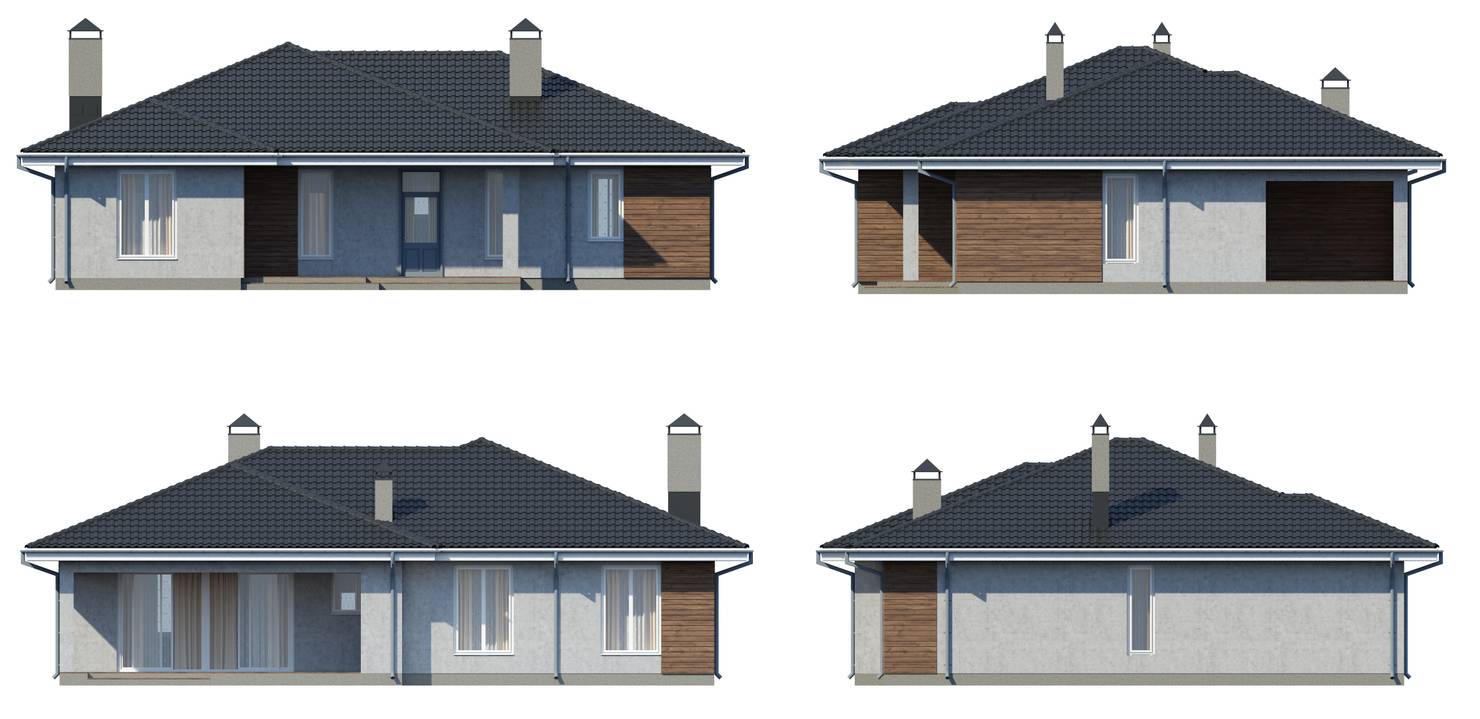 Одноэтажное бунгало и дизайн его фасадов со всех сторон