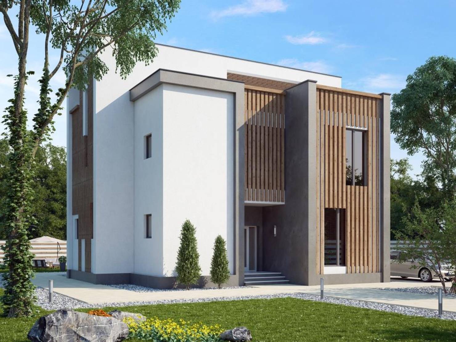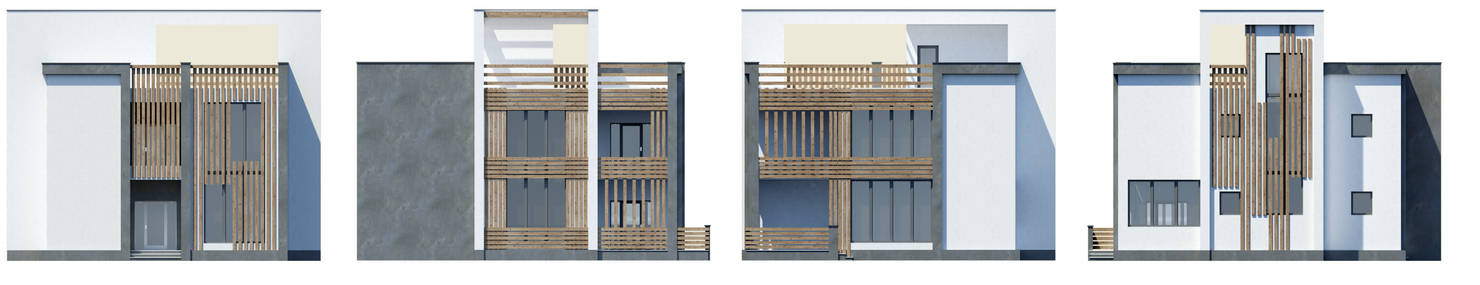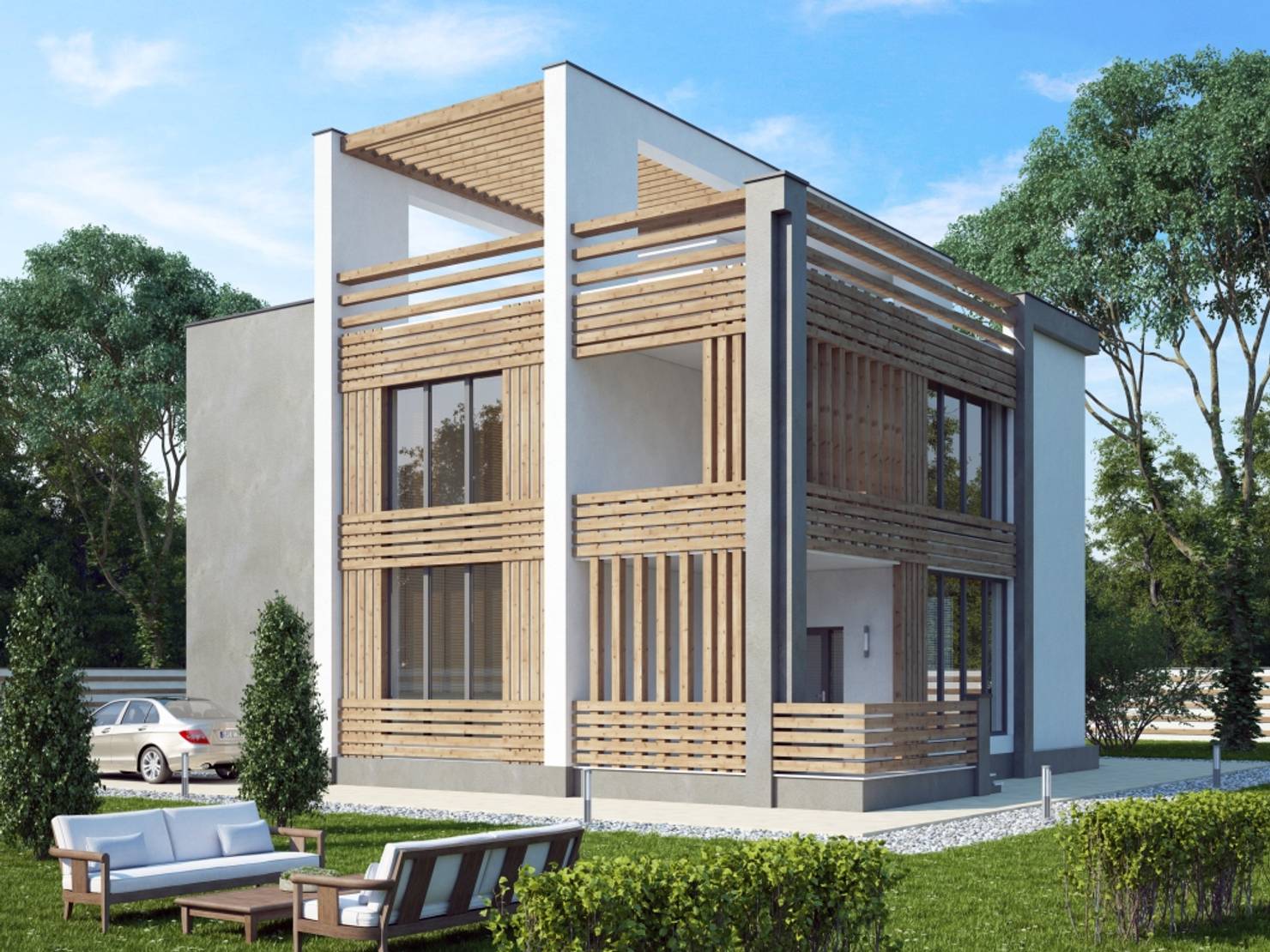 Фасады из лиственницы и комбинации штукатурок
