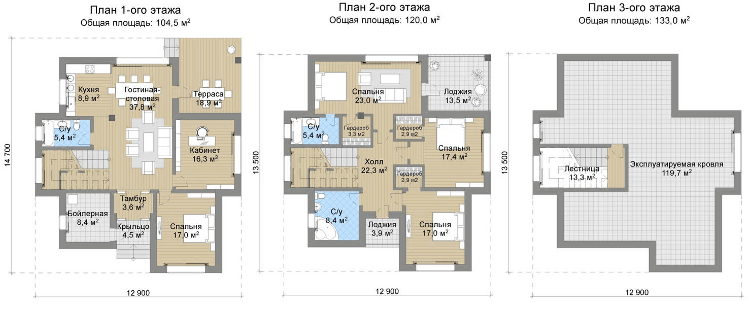 Общая планировка двухэтажного дома с четырьмя спальнями