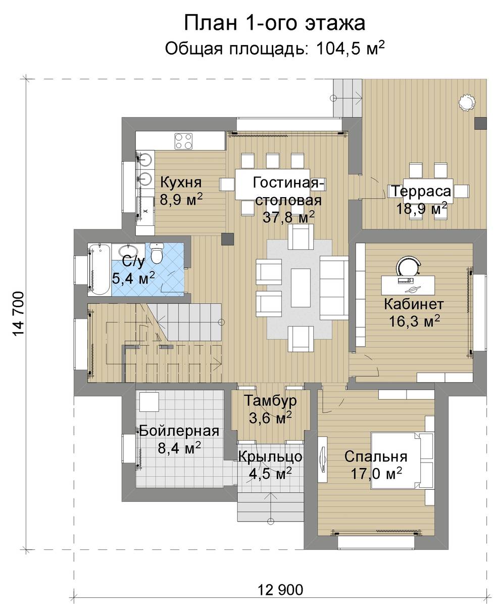 Планировка первого этажа: приватные комнаты и общественная зона