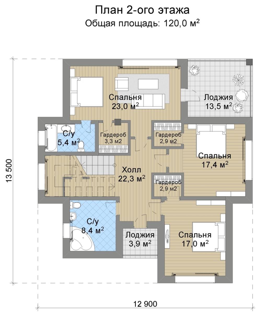 Планировка второго этажа: три спальни и две ванные комнаты