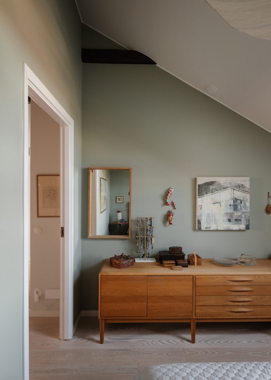 Важную роль в создании атмосферы играют открытые деревянные балки, которые подчеркивают мансардный характер помещения и добавляют текстуру. В ходе ремонта было решено сохранить оригинальную штукатурку стен, что придает интерьеру аутентичность. Полы же были полностью обновлены — теперь это прочные и теплые сосновые доски.