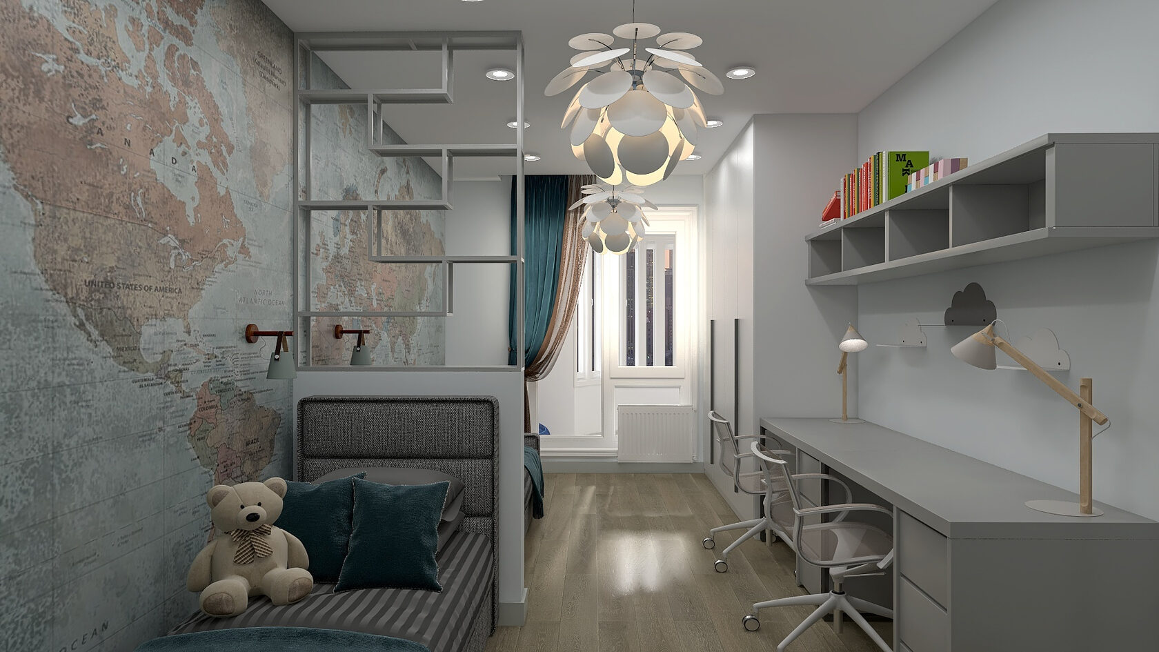 В детской для создания теплой атмосферы была использована текстильная отделка стен. Практичным решением стала кровать с выдвижным вторым спальным местом, что экономит пространство для игр.