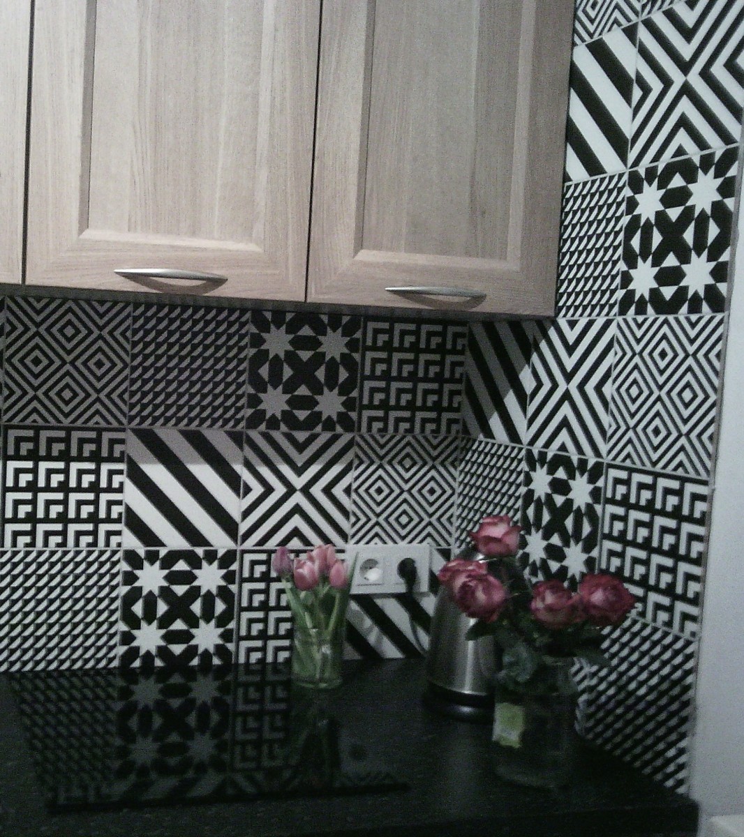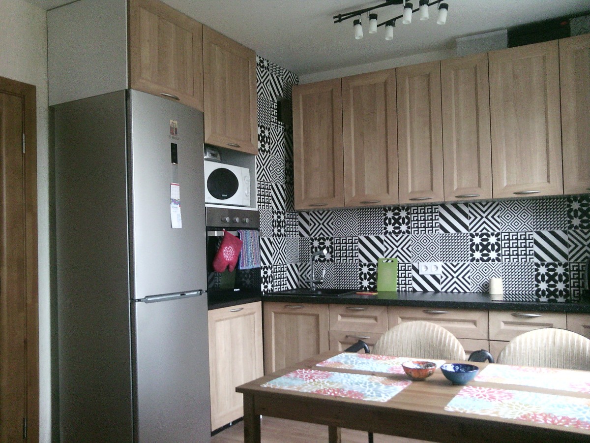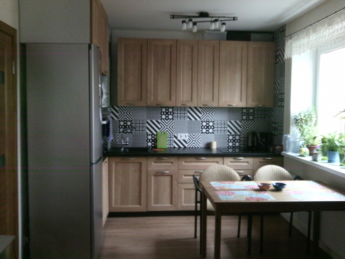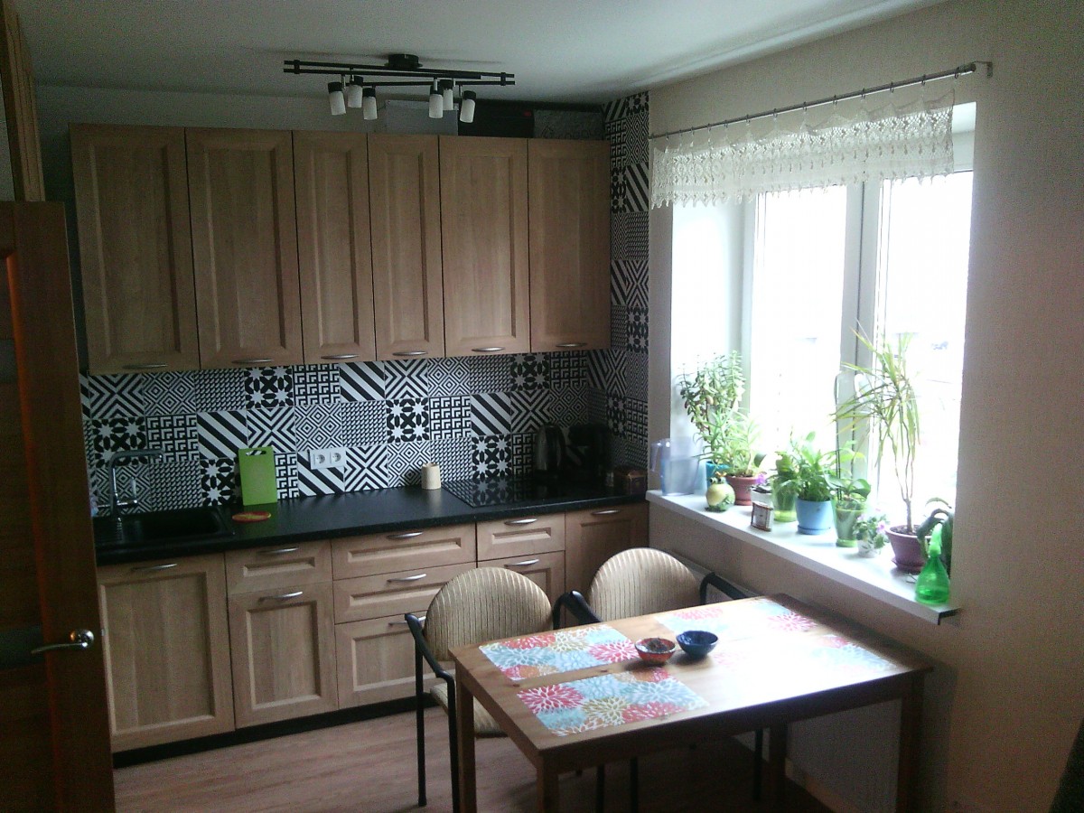 Кухонный гарнитур мы заказали у «Столплит», для фартука использовали белорусскую плитку, а на пол постелили виниловое покрытие (винилпол). И вот здесь — отдельная история! Я уже двести пятьдесят раз пожалела, что не выбрала обычный линолеум. Винилпол оказался очень марким и быстро поцарапался, причём непонятно, кем и когда. Спасает только моя близорукость, которая не позволяет разглядывать все эти повреждения в деталях.