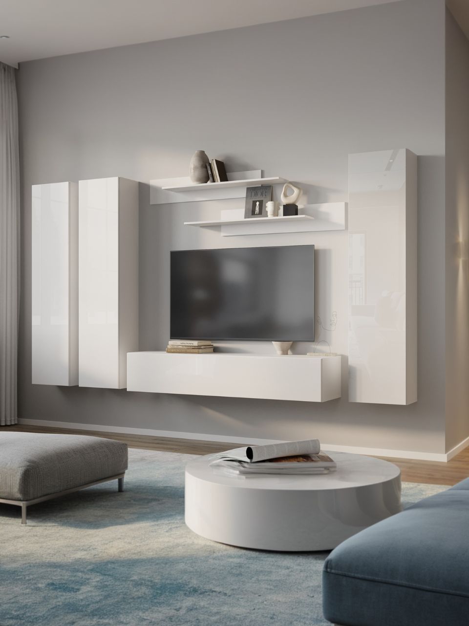 Составляющие конструкции сочетаются между собой, образуя всевозможные комбинации. Допускается фиксация на стене с помощью подходящих крепежных элементов. Можно соединить два-три модуля для получения миниатюрной стенки или собрать композицию, которая займет одну или две стороны гостиной.