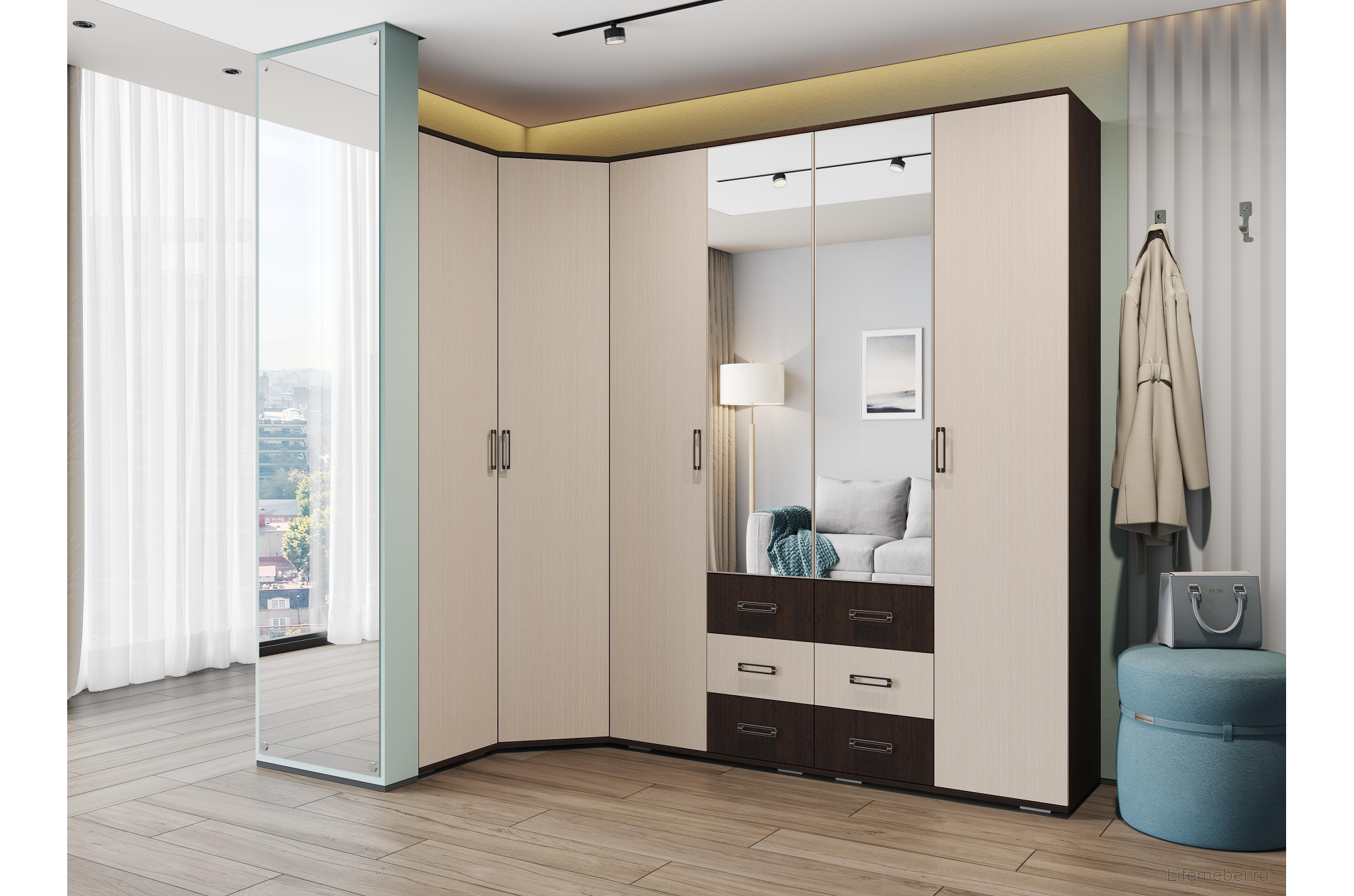 - Прихожая: Комплект из ЛДСП оттенка молочный дуб (вешалка, тумбы, зеркало, шкаф) эффектно контрастирует со стенами и полом тёмно-коричневого цвета, например, под венге. Дополнить образ можно светлым паласом и входной дверью бежевого, более тёмного, чем гарнитур, оттенка.