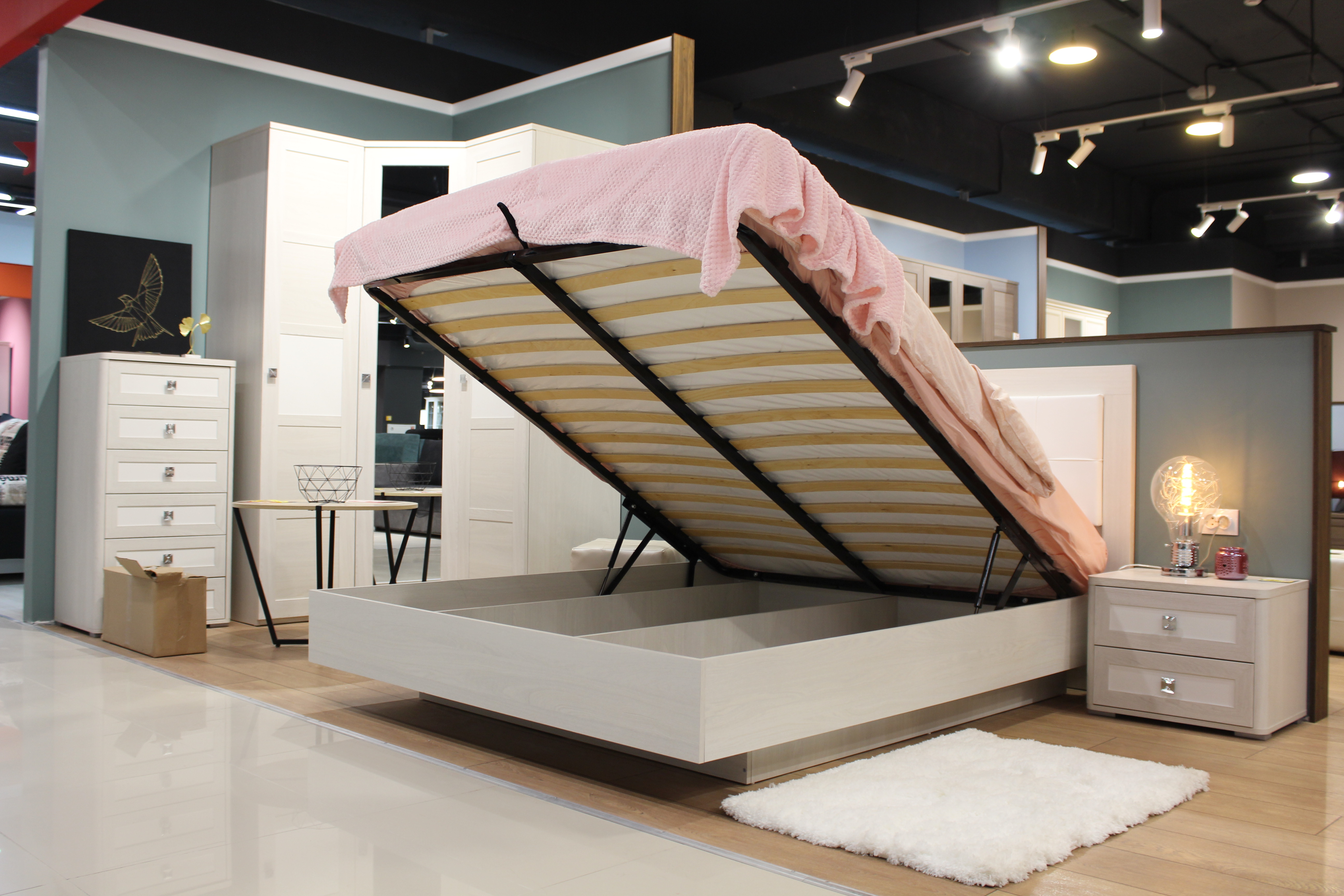 - Полная комплектация с изголовьями и матрасами.