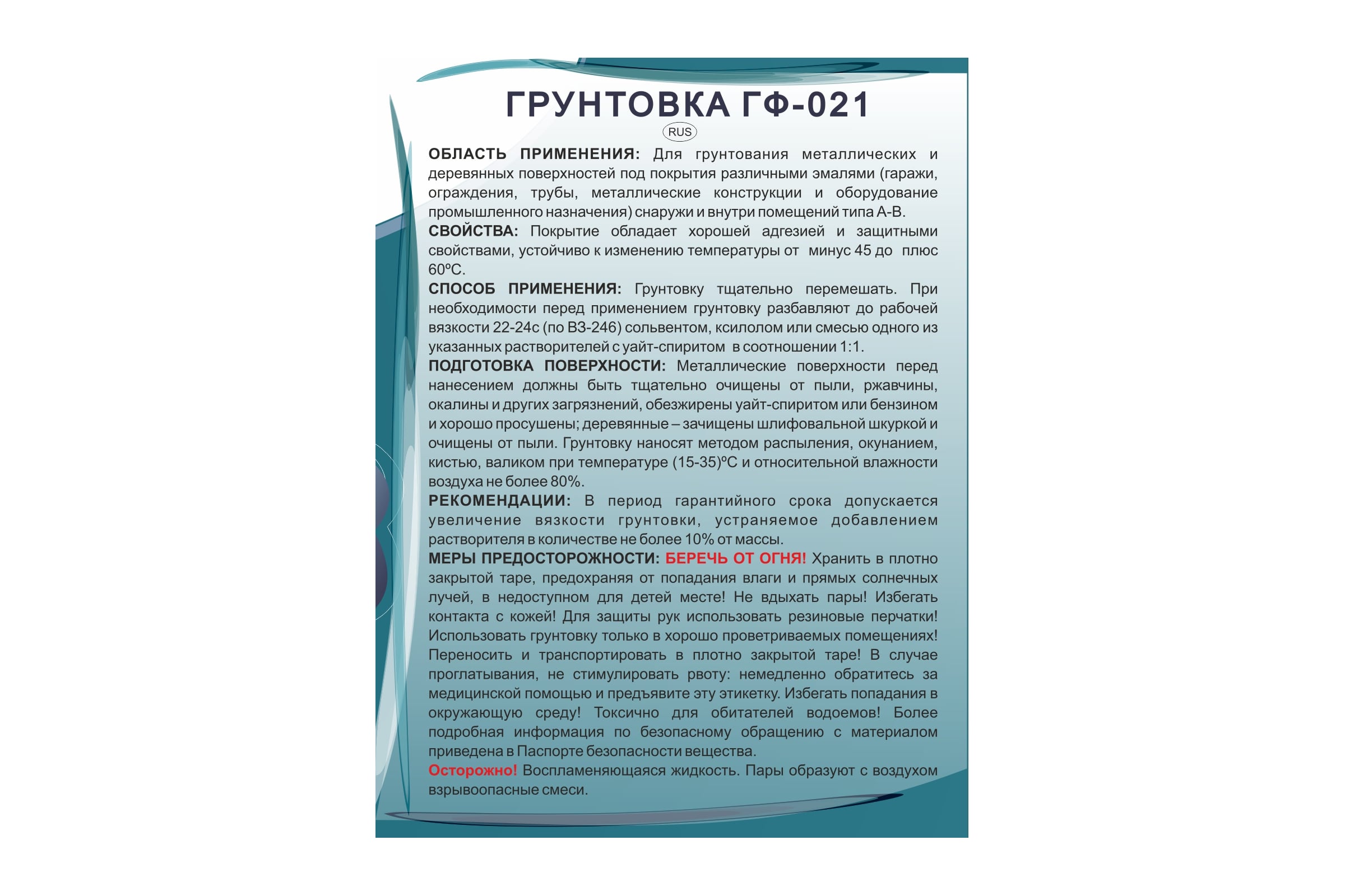 Важно помнить, что из-за содержания органических растворителей грунтовка является горючей и токсичной. Её пары могут оказывать наркотическое воздействие, раздражать слизистые оболочки глаз и дыхательных путей. При работе необходимо: