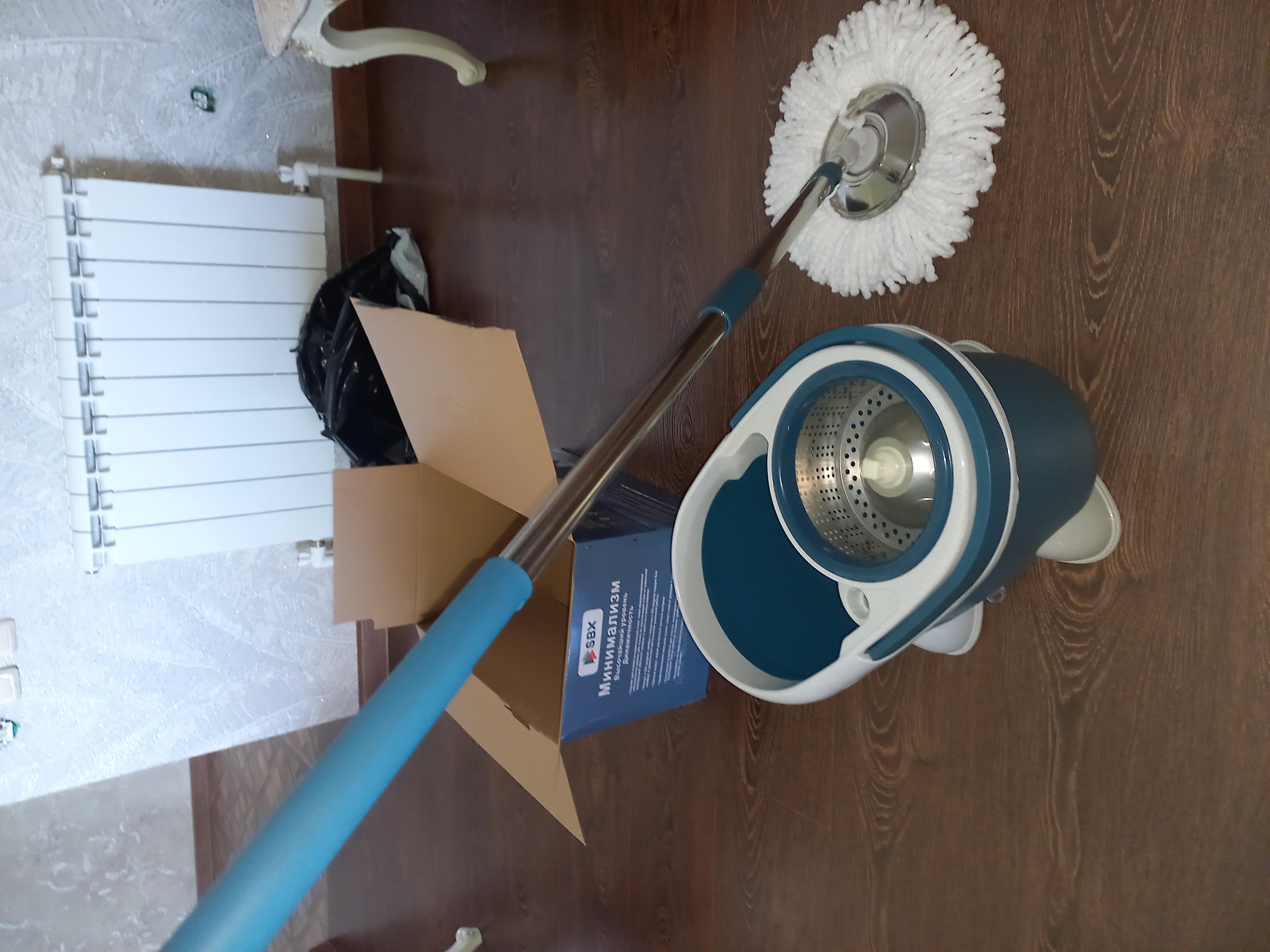 Работать с такой шваброй одно удовольствие. Ведро вмещает до 8 л жидкости. В верхней его части предусмотрено специальное приспособление для отжима. Оно сделано в виде центрифуги. На пластмассовой основе прикреплена перфорированная чаша из нержавеющей стали. С ее помощью всего за 10 сек. убирается до 90% жидкости из насадки. Многое зависит от количества нажатий на нее. Складная ручка (высота – 124 см) выдерживает нагрузку до 10 кг. Но важно помнить, что она имеет пластмассовое крепление, которое может сломаться.