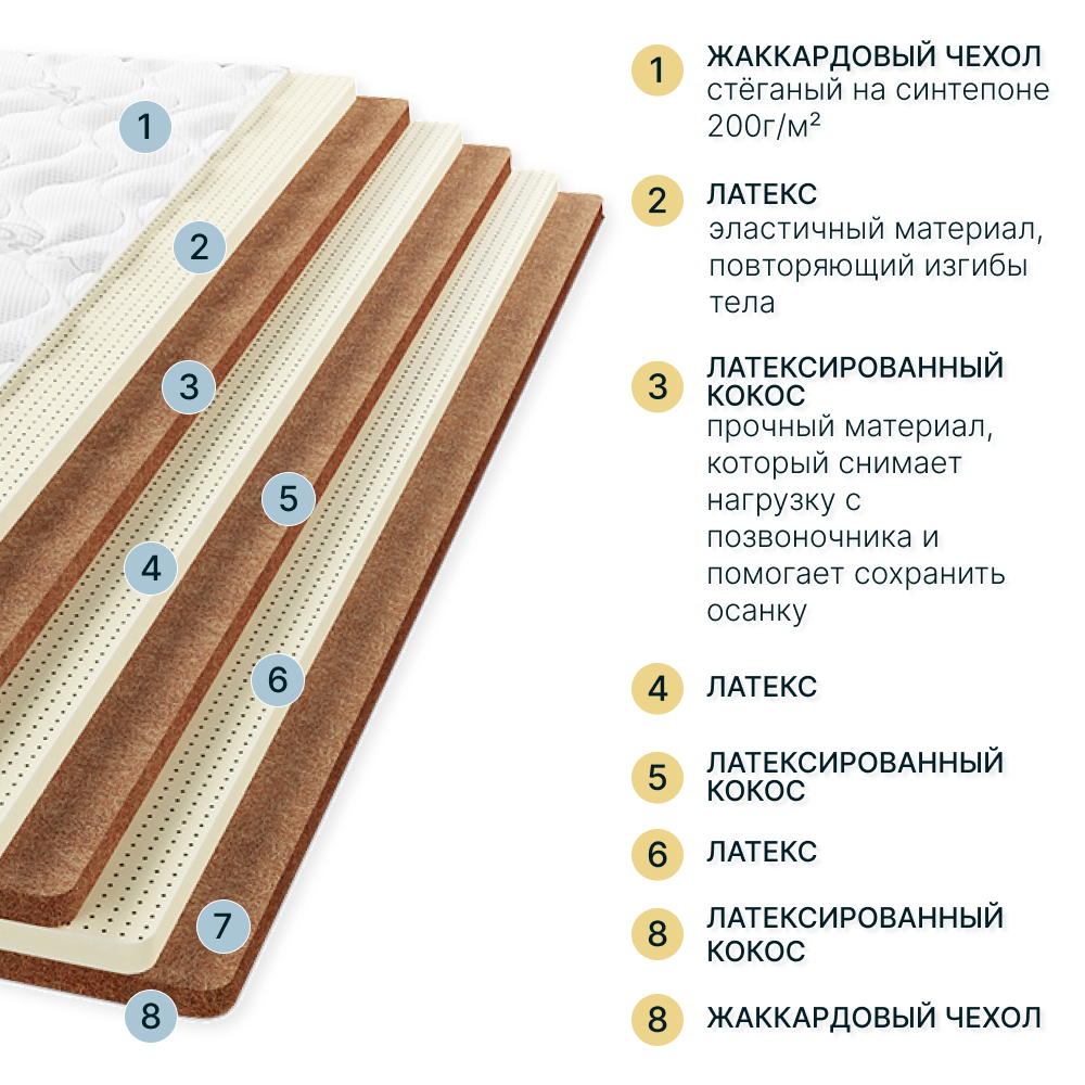 Наполнителем выступают традиционные материалы: кокосовая койра – жесткий матрас, латекс – мягкий, пенополиуретан – тоже мягкий. Комбинированные модели редки.