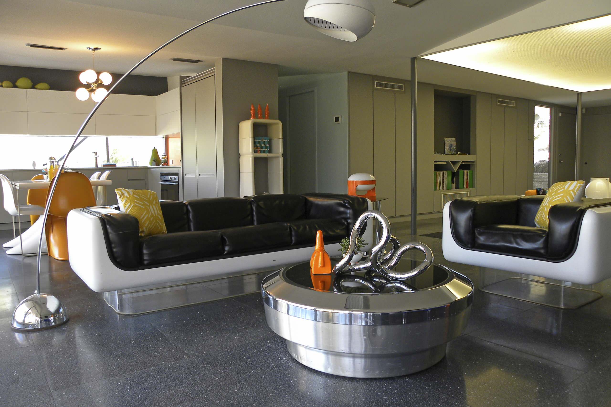 Интерьер преимущественно составляется из мебели, изготовленной из прочного стекла, разных вариаций металла, цветного пластика, дерево используется редко. В основном выбирают мягкие диваны, но они обязательно должны иметь съемные чехлы из синтетических материалов, карманы для газет и пультов управления, разные положения и необычную форму.