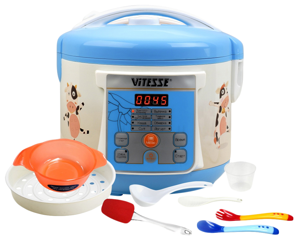 В набор оборудования для детской мультиварки чаще всего входят различные мерные ложечки, стаканчики для приготовления пудинга или йогурта, сетка для готовки на пару, щипцы, прихватки и ручки для безопасного извлечения чаши, сборники рецептов.