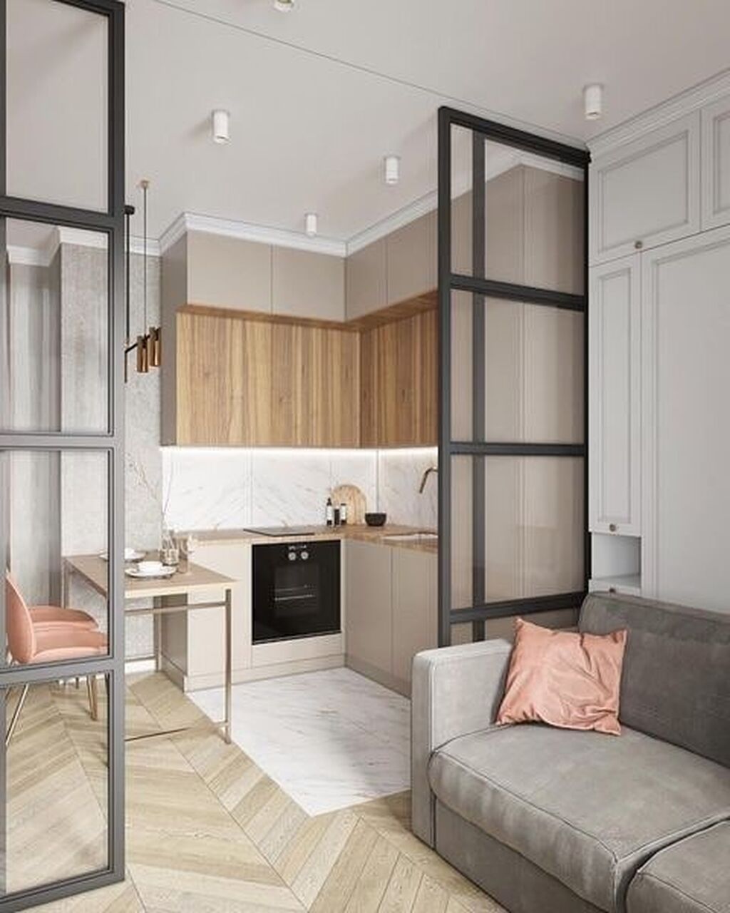 Дизайн маленькой квартиры для молодой семьи, расположенная в новостройке столицы Болгарии, имеет достаточно свободного места, чтобы из «однушки», сделать «двушку», благодаря декоративным перегородкам.