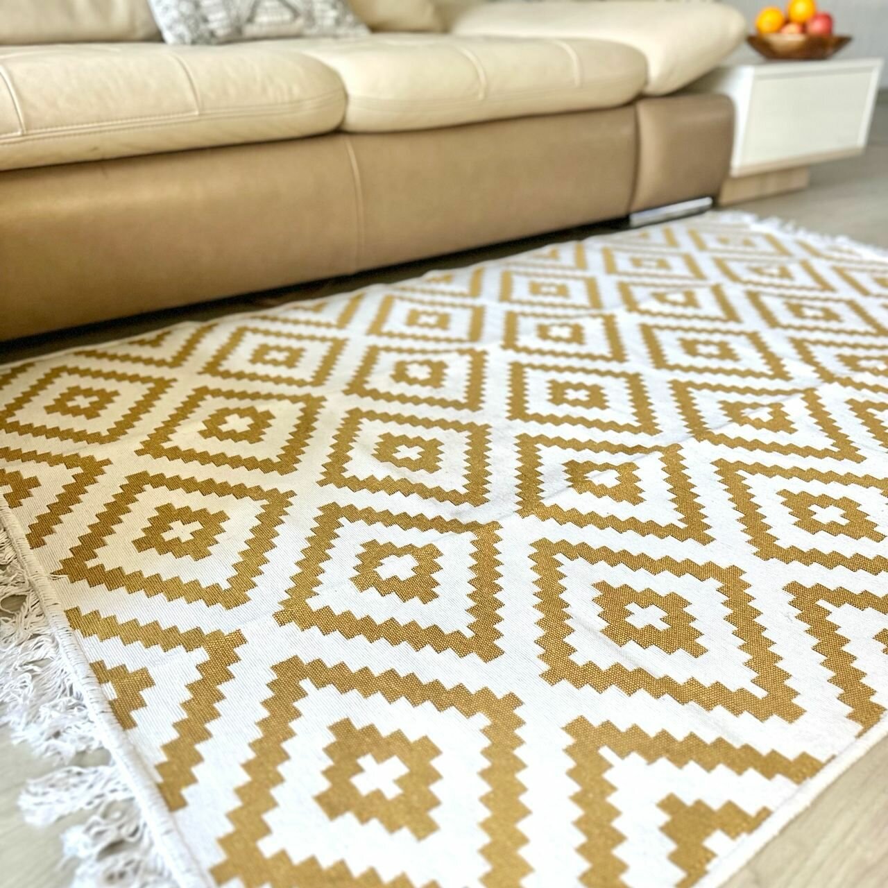 Квадратные ковры небольшого размера 2 на 2 метра сочетаются с разными стилями интерьера, эффектно смотрятся со строгой классикой, вызывающим китчем, лаконичным минимализмом, утонченным шале.