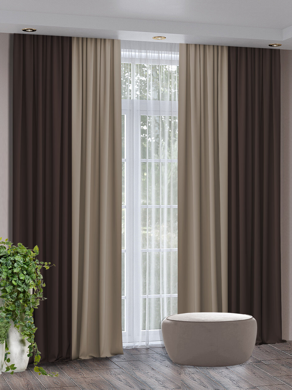 Ключ к успеху — в гармоничном сочетании цвета штор с остальными элементами обстановки. Идеально, если в помещении уже присутствует мебель в двухцветном исполнении, например, комбинация венге и бежевого. При этом светлого оттенка должно быть больше — это создаст сбалансированный фон для темных штор. Также стоит продумать сочетание с текстилем: покрывалом, декоративными подушками. Главное — соблюдать умеренность и не перегружать пространство: двух-трех акцентов будет вполне достаточно для создания целостной и стильной картины.