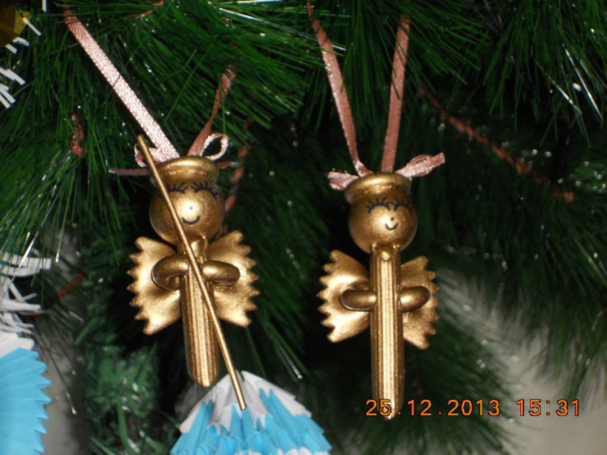 Нимб склеивается из макарон-рожек. В руки ангелу можно вложить свернутую в трубочку бумагу (свиток) или маленькую книжечку. Собрав все детали воедино, вы получите великолепную сверкающую игрушку.