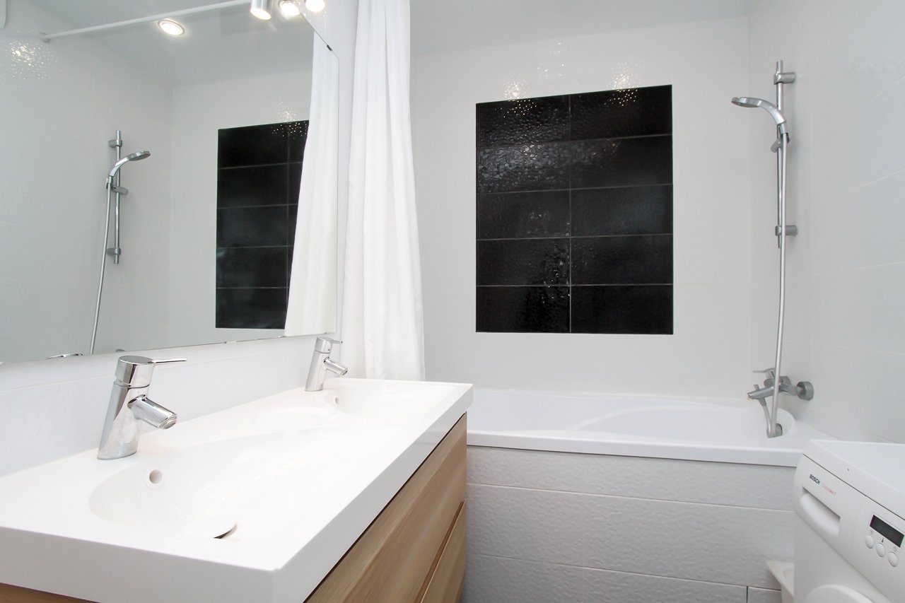 Создание минималистской ванной — задача непростая, ведь нужно грамотно скрыть все необходимые в быту мелочи. Решение — использование мебели простых, чётких геометрических форм, часто встроенной. Вся мебель подбирается невысокой и лаконичной, чтобы не создавать визуальной перегруженности.