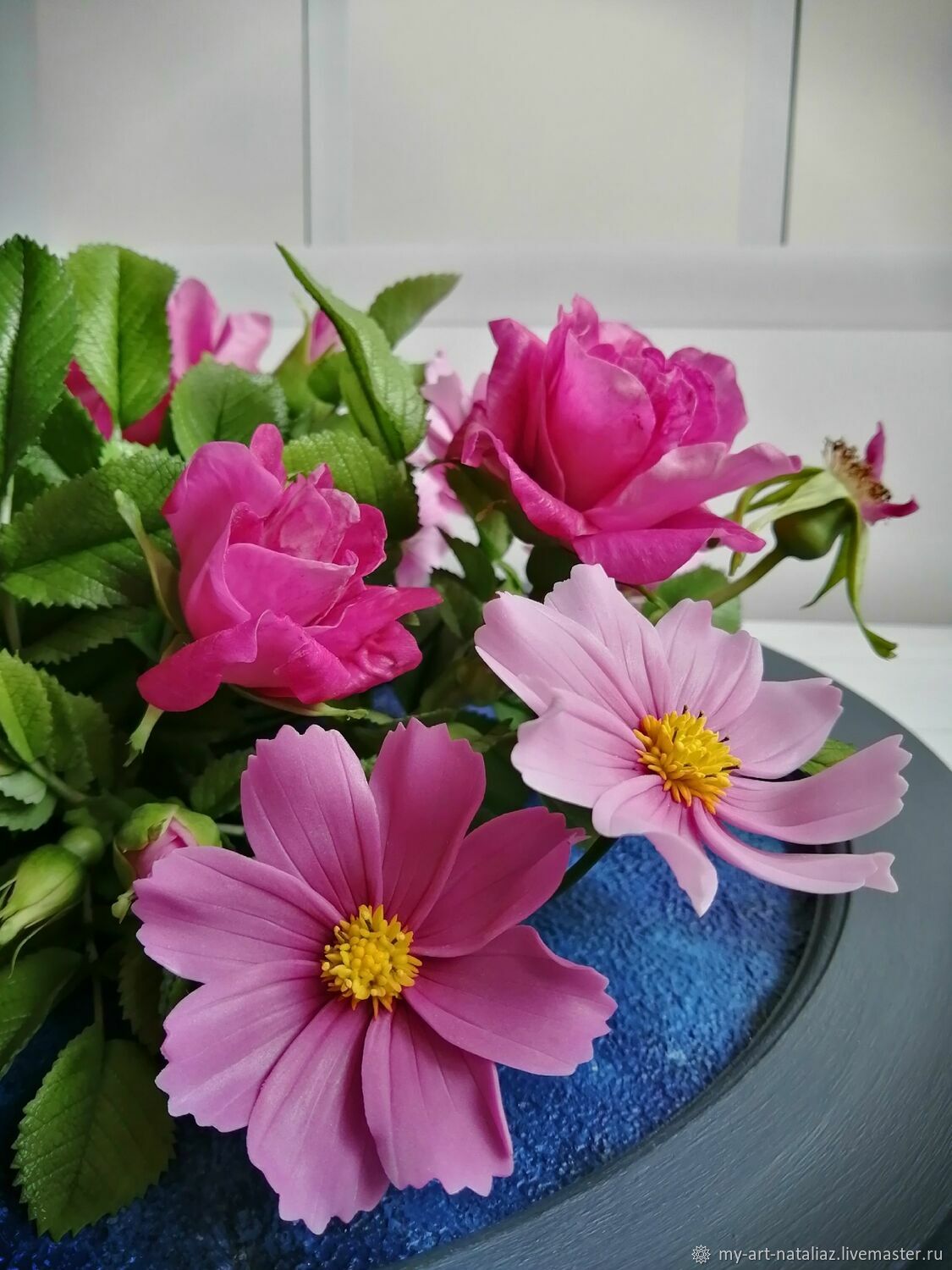 Используя специальную форму, делаем листики из зеленого фарфора, наносим бороздки, крепим к проволоке. Для тонирования серединки используем краску. Завершаем создание букета оформлением его в горшок. Наше изделие готово!