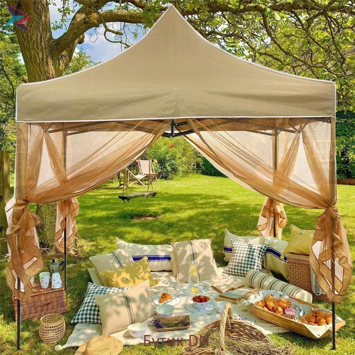 Если размеры участка не позволяют построить постоянную беседку, то можно установить шатер.
