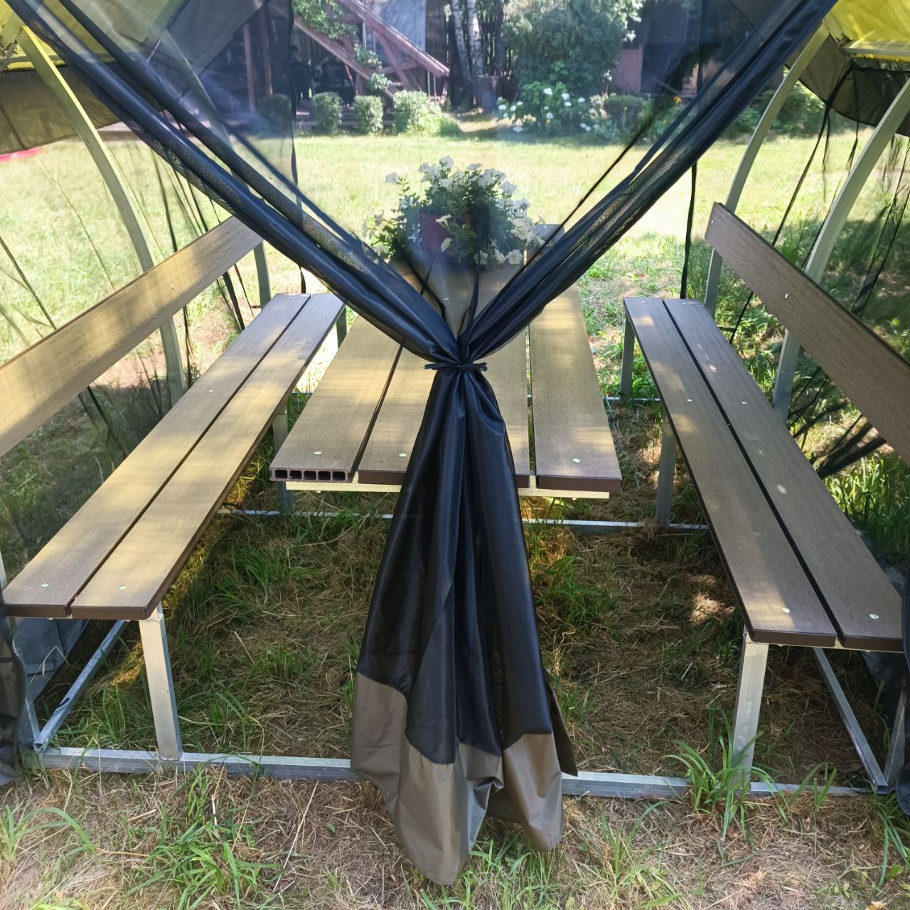 Такая конструкция устанавливается просто — на закрепленные к раме беседки кронштейны. Главное, не ошибиться с размерами проемов при заказе. В районе входа можно установить такие рамки в виде дверей на петлях.