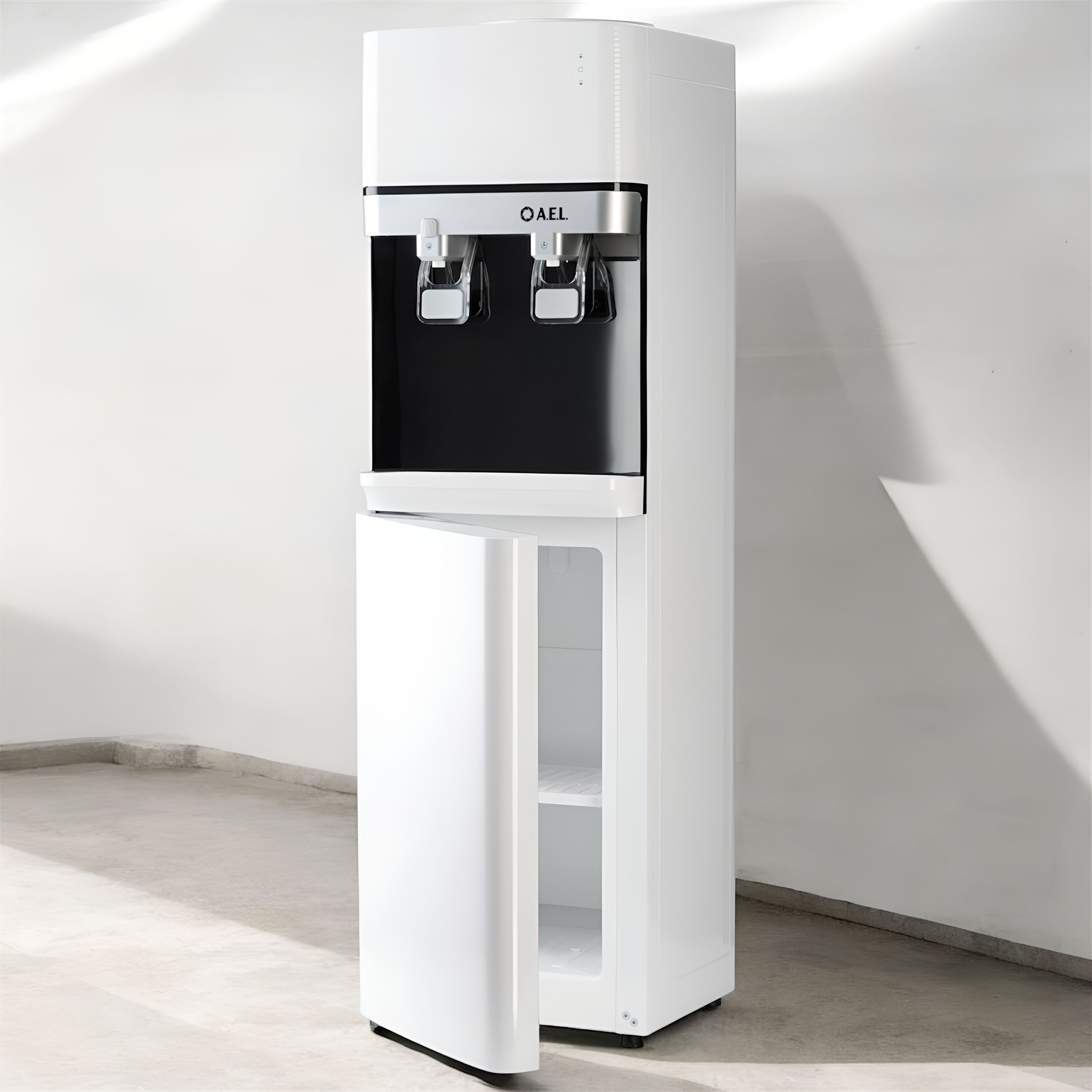 - Напольные кулеры. Отличаются большим объёмом резервуара для воды и устанавливаются непосредственно на пол. Их главное преимущество — универсальность размещения. Такой аппарат можно поставить в любом удобном месте помещения, обеспечив к нему свободный доступ.