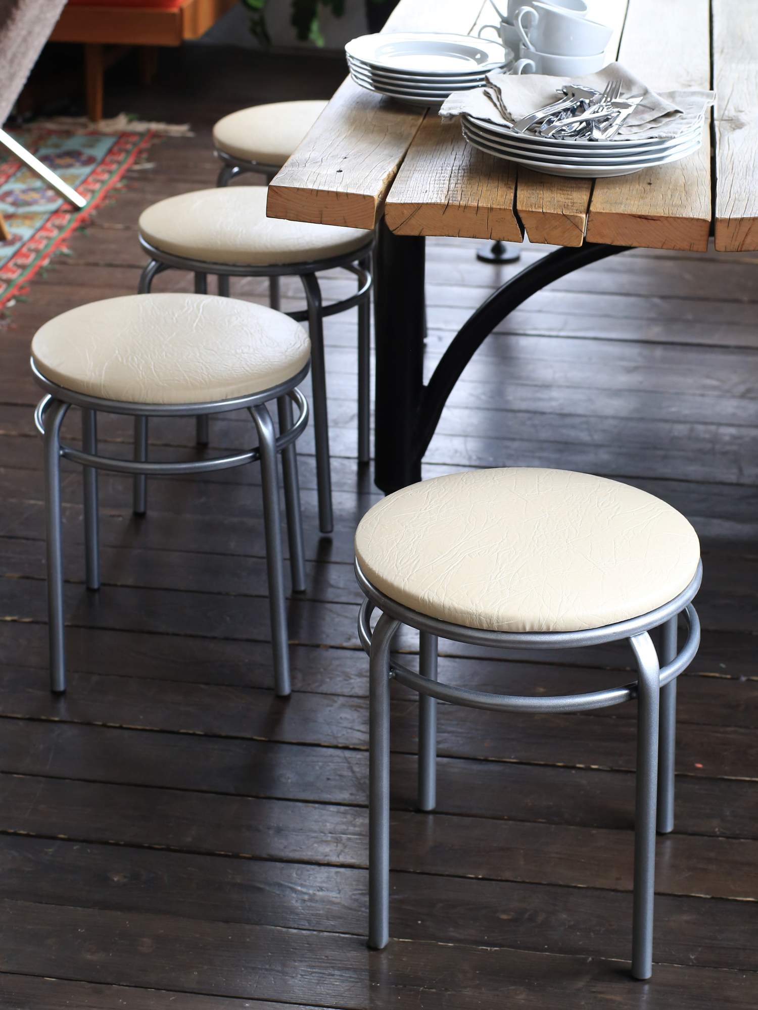 Табуреты — практичный выбор для большой семьи. Кроме того, они отлично комбинируются с другой мебелью. Например, возле стола можно поставить небольшой диван, а остальные места занять табуретками. Также их можно сочетать с обычными стульями, что позволяет гибко использовать даже самое скромное пространство.