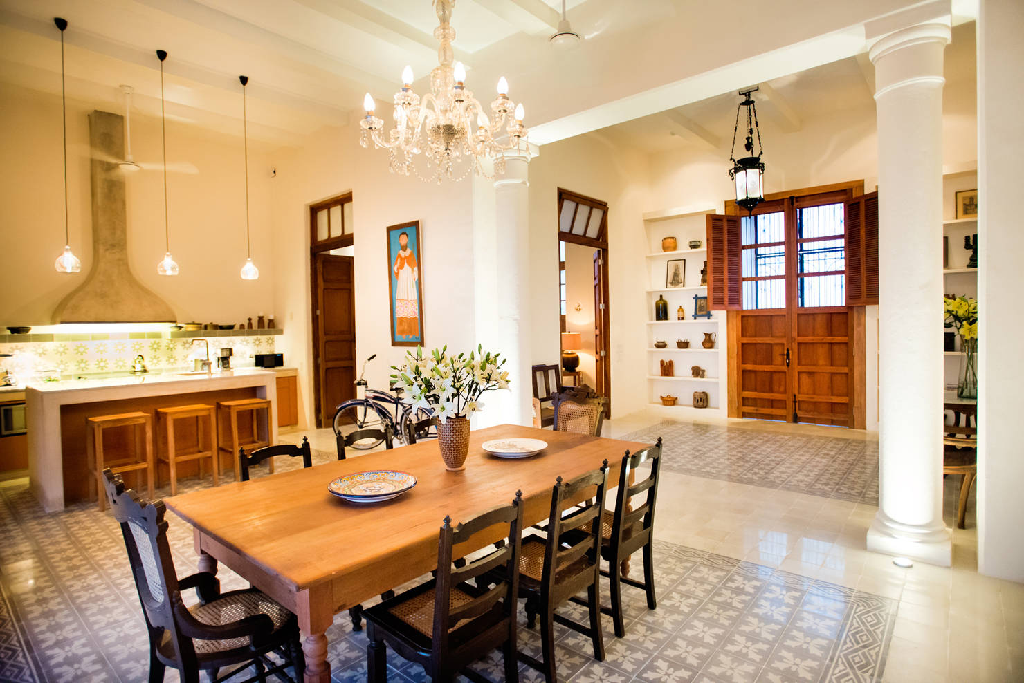 Широкая и выразительная арка вместо стандартной двери в проёме — отличное решение для интерьеров с открытой планировкой, особенно в домах традиционной архитектуры. Этот приём создаёт плавный переход между помещениями, предлагая золотую середину между открытым и закрытым пространством.