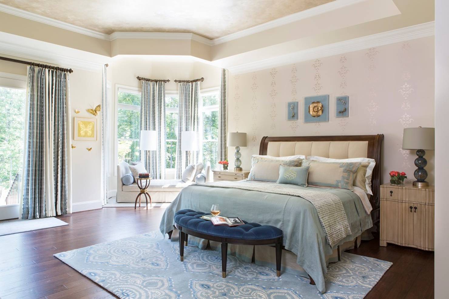 Небольшая кушетка, размещённая у окна и дополненная яркой декоративной подушкой, добавляет классической спальне атмосферу спокойствия и комфорта. Это идеальное место для уединённого отдыха с книгой или чашкой чая.