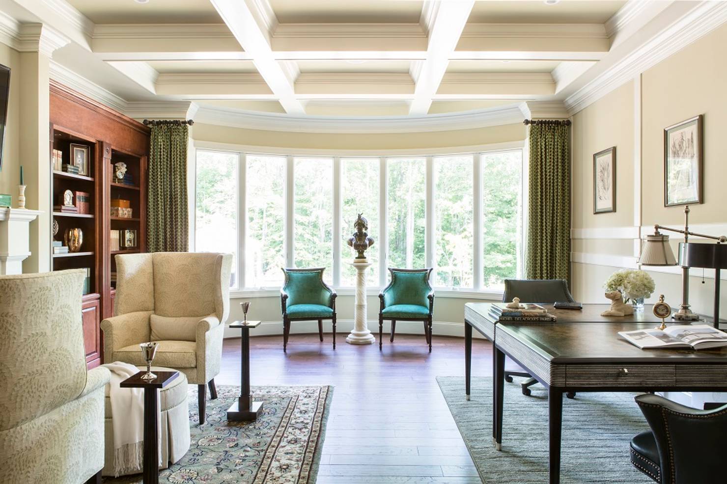 В этом офисе продумано три зоны: рабочий стол для бумаг, мягкий диван для отдыха и пара кресел у окна для неформальных встреч. Классический строгий стиль здесь сочетается с практичностью и эргономикой.