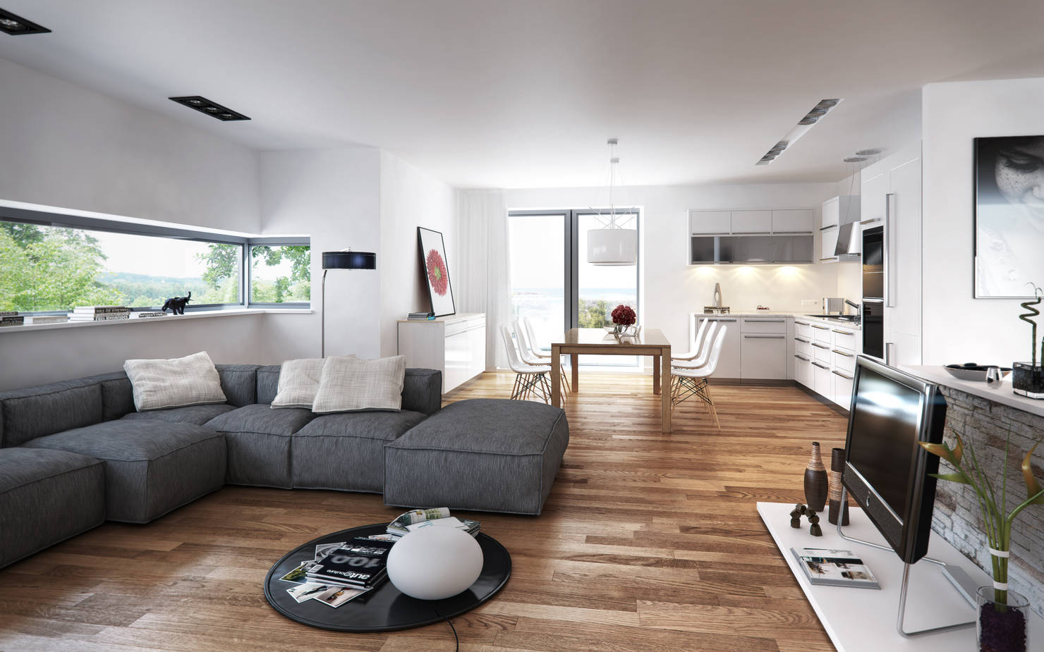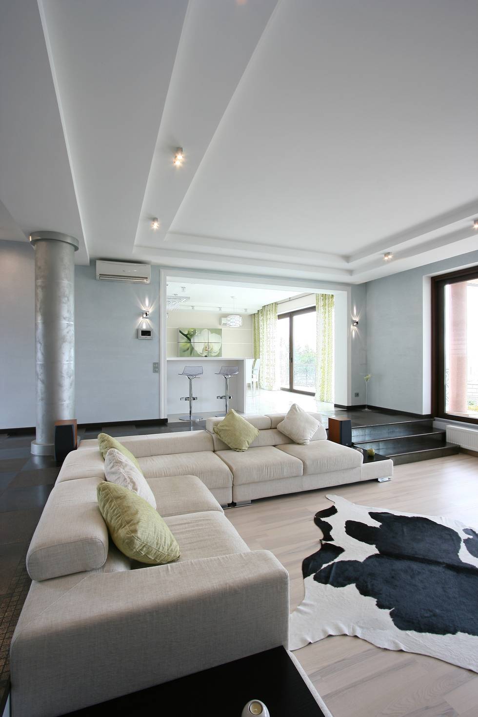 Эта просторная гостиная — образец уютной и одновременно элегантной обстановки. Дизайн делает акцент на универсальности и практичности, следуя ключевому правилу минимализма: само пространство выступает главным элементом интерьера. Комната воспринимается как самостоятельный арт-объект, поэтому всё её наполнение — мебель и декор — должно оставаться простым и лаконичным, не перегружая восприятие.