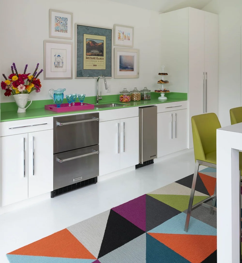 Главное правило при работе с лаймом — умеренность. В большом количестве он может быть утомительным. Идеальное решение — кухонный гарнитур, где лайм сочетается с белым, а обеденная группа или остров выполнены в светлых тонах. Чем ярче оттенок зеленого, тем больше ему требуется нейтрального фона для баланса.