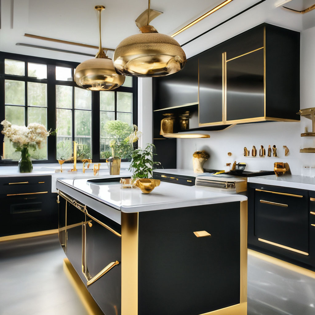 Сочетание черного с золотом, серебром или медью мгновенно придает интерьеру роскошный, почти театральный вид. Металлические элементы в фурнитуре, ручках, светильниках, ножках мебели или в отделке фартука сверкают на темном фоне, создавая эффектный контраст.