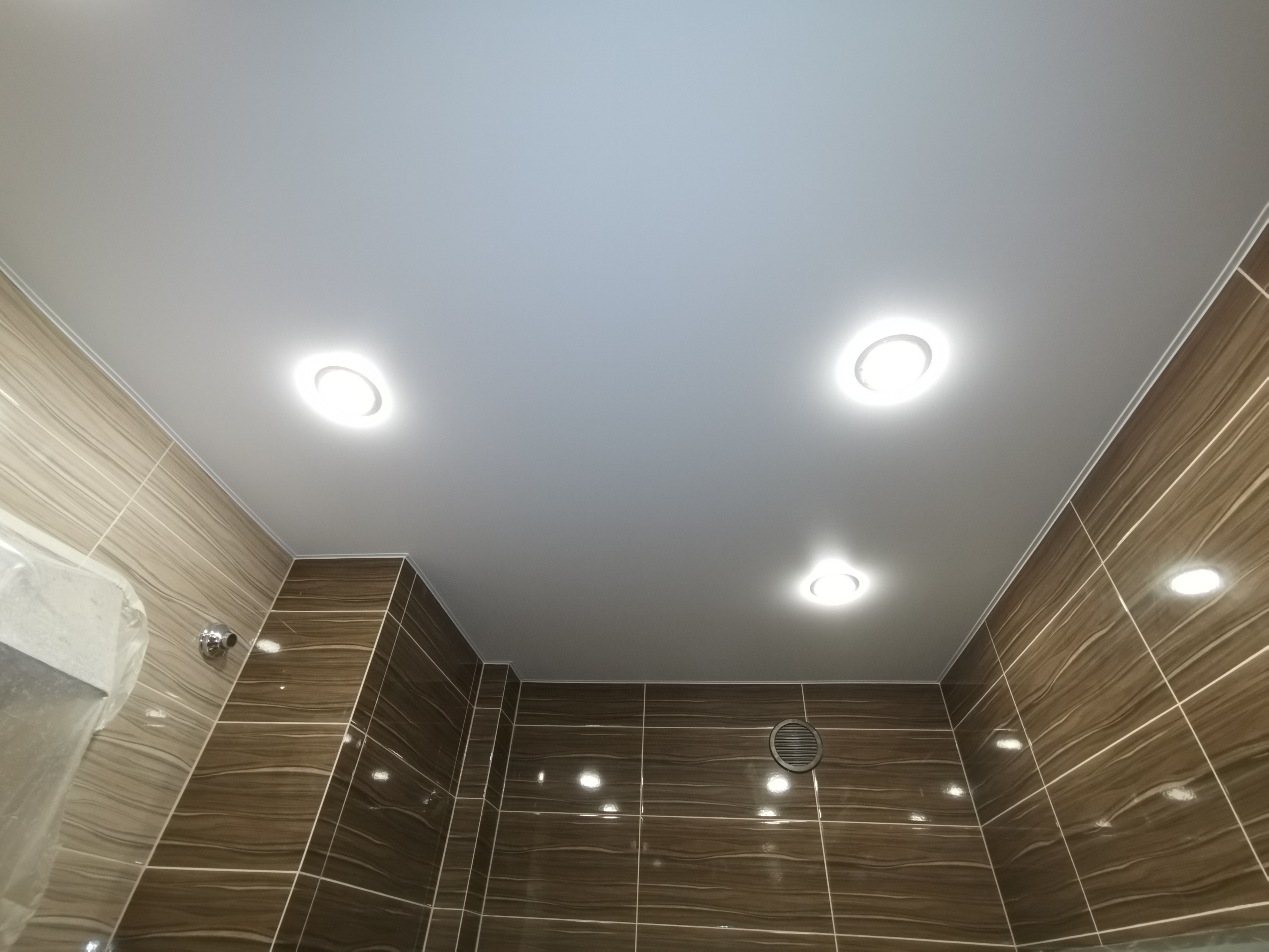 А вот тканевые потолки для ванной не годятся. Их основа, несмотря на пропитку, имеет низкую паропроницаемость. Влага может проникать под полотно, что со временем приводит к появлению неэстетичных разводов и пятен.