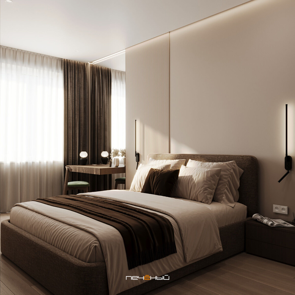 Самый популярный интерьер спальни. Подразумевает использование только самой необходимой мебели (кровать, комод, прикроватные тумбочки, др.) и ничего лишнего. Этот стиль построен прежде всего на комфорте и удобстве. Свойственны ему в основном светлые оттенки.