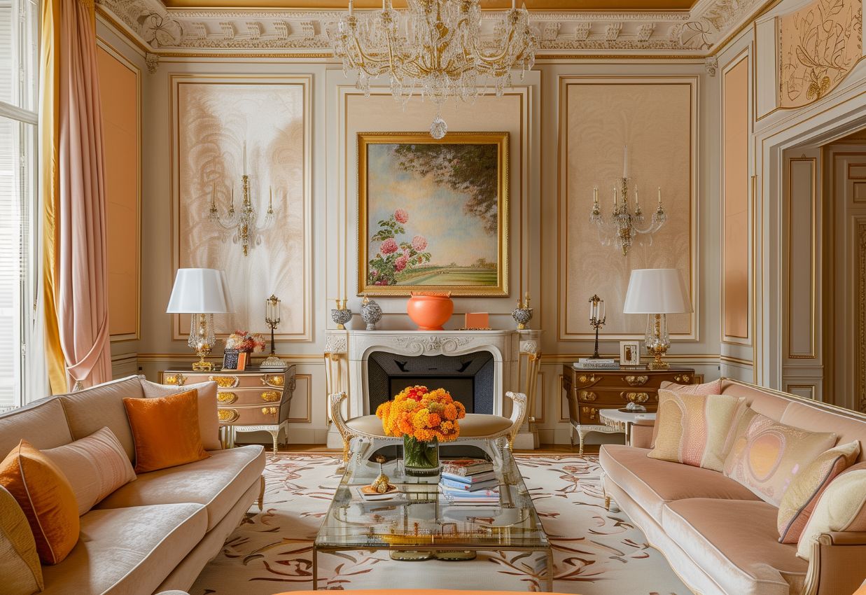 - основные предметы украшения: большие зеркала в роскошных рамах, небольшие скульптуры, картины и напольные вазы.