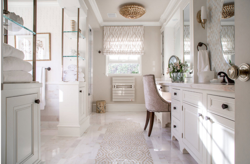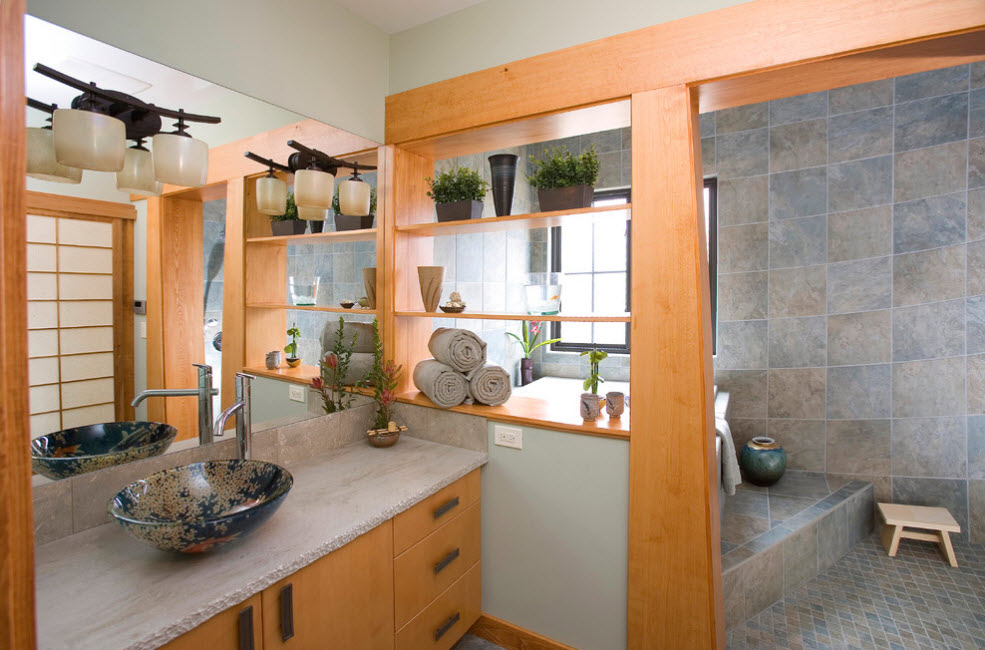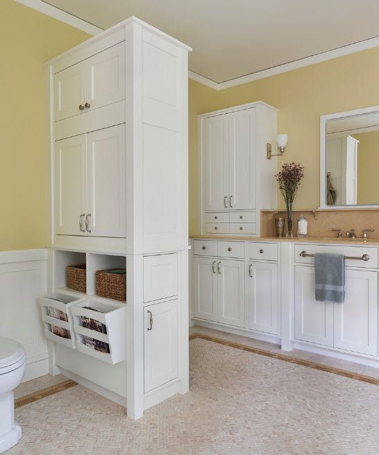 В просторной ванной комнате стеллаж-перегородку можно использовать для разделения зоны для водных процедур и туалета. В такой системе хранения можно разместить не только банные принадлежности и аксессуары для различных водных и санитарно-гигиенических процедур, но и запас полотенец для всей семьи.