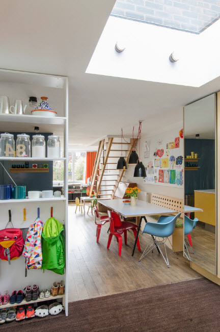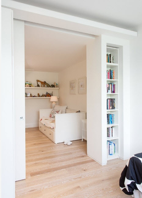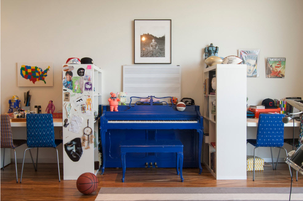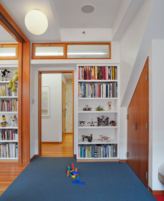 Стеллажи офисного стиля часто используются и в жилых пространствах. Например, в детской комнате для двоих и более детей можно разграничивать рабочие и спальные места невысокими стеллажами офисного типа. Помимо очевидного зонирования, такие стеллажи служат отличными системами хранения для книг, игрушек, школьных и спортивных принадлежностей.