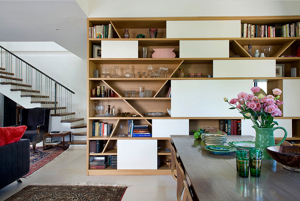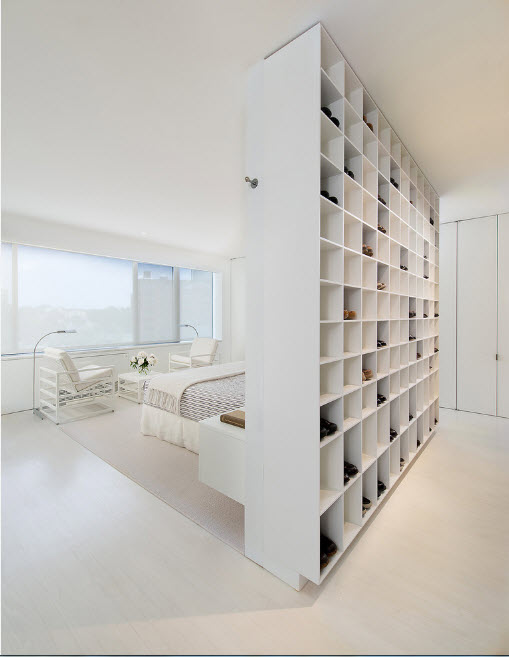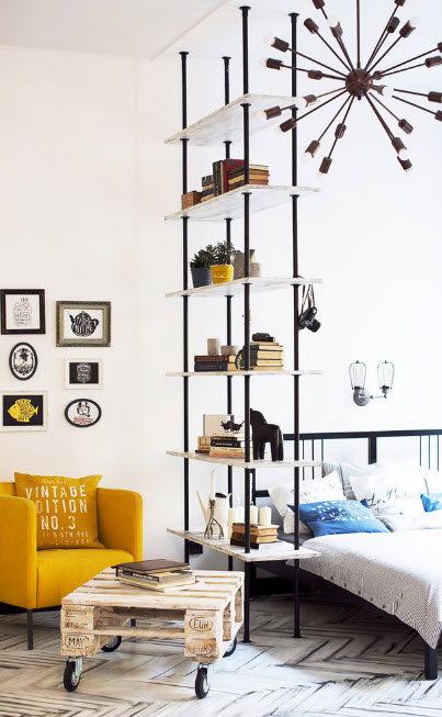 Одним из нас необходимо выделить отдельную зону в малогабаритном помещении, другим, напротив, важно разделение пространства в большой квартире-студии, третьи просто нуждаются в дополнительной систем хранения. В какой бы ситуации вы не оказались, стеллаж в качестве перегородки станет наилучшим решением. Он эффективно разделит пространство, станет вместительной системой хранения и при этом не потребует серьезных финансовых затрат и времени по организации перегородки. В помещении с одни окном невозможно выстроить сплошную стену для разделения пространства на зоны, ведь тогда один из функциональных сегментов окажется без источника естественного освещения. «Полупрозрачный» стеллаж без фасадов и часто без боковых стенок, станет отличным решением для малогабаритного помещения. В просторной комнате можно не ограничиваться в выборе модели стеллажа – использовать самые смелые и оригинальные решения. А вариантов по созданию современных стеллажей дизайнеры нам предлагают немало. Именно с такими проектами нам хотелось бы познакомить вас при помощи подборки из 100 моделей стеллажей, использованных в самых разнообразных помещениях.