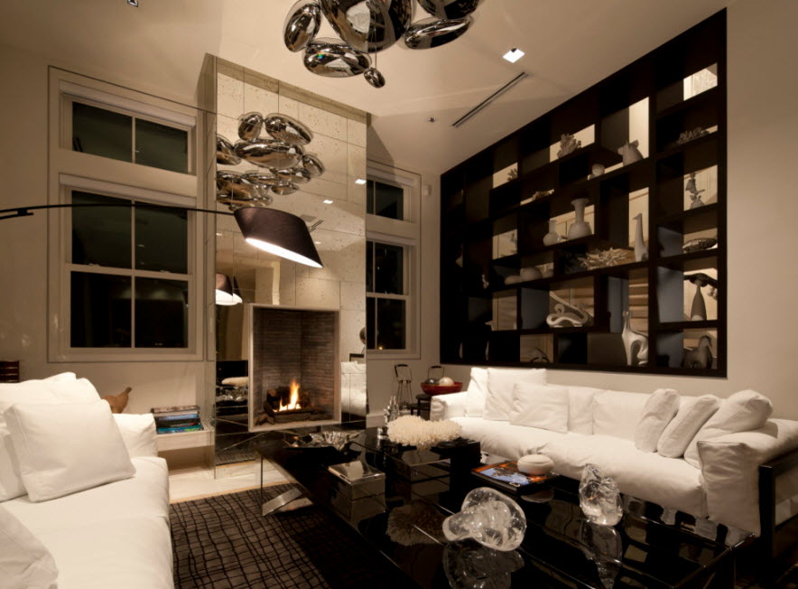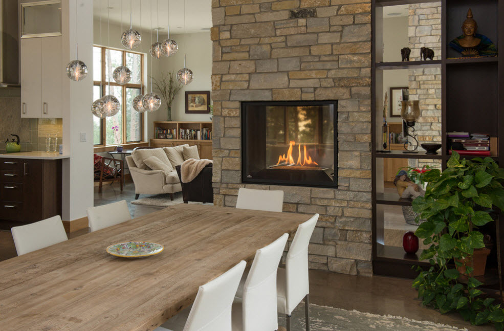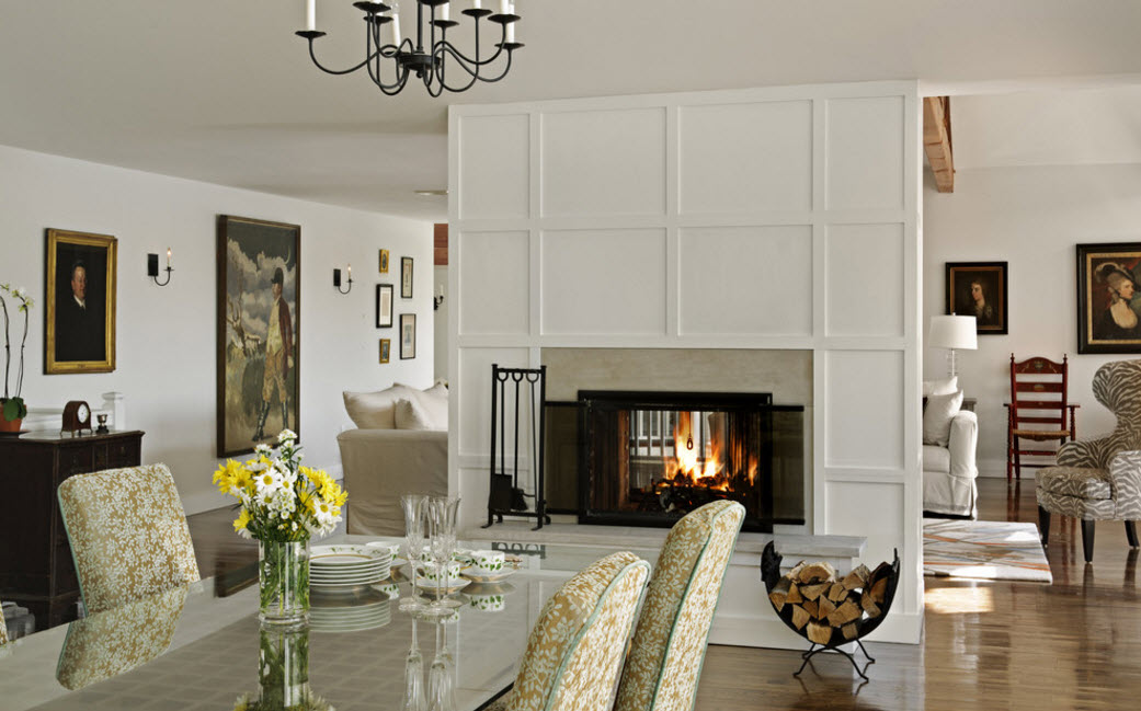 Нередко в качестве перегородок в просторных помещениях используются двухсторонние камины – очаги, за танцем огня в которых можно наблюдать с обеих разделяемых функциональных зон. Логичным продолжением такой перегородки станет стеллаж. Он может быть «полупрозрачным» или глухим – все зависит от того, насколько сплошной должна быть ваша перегородка.