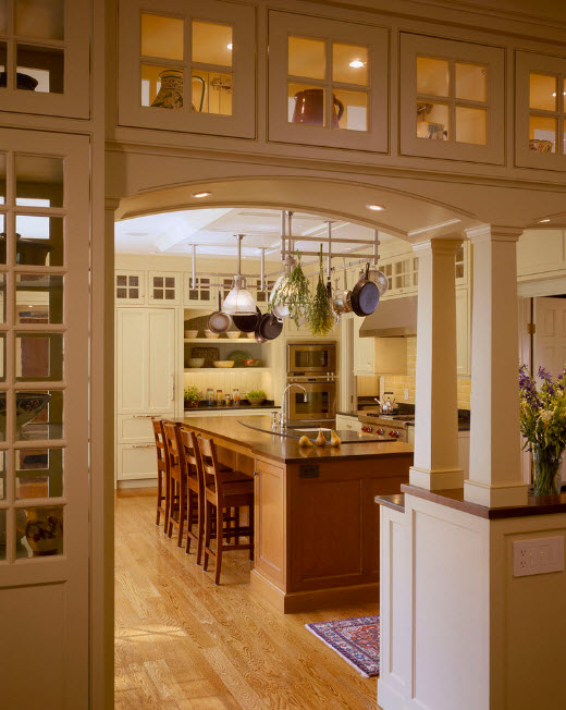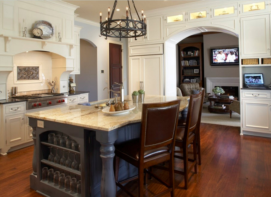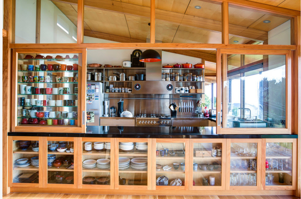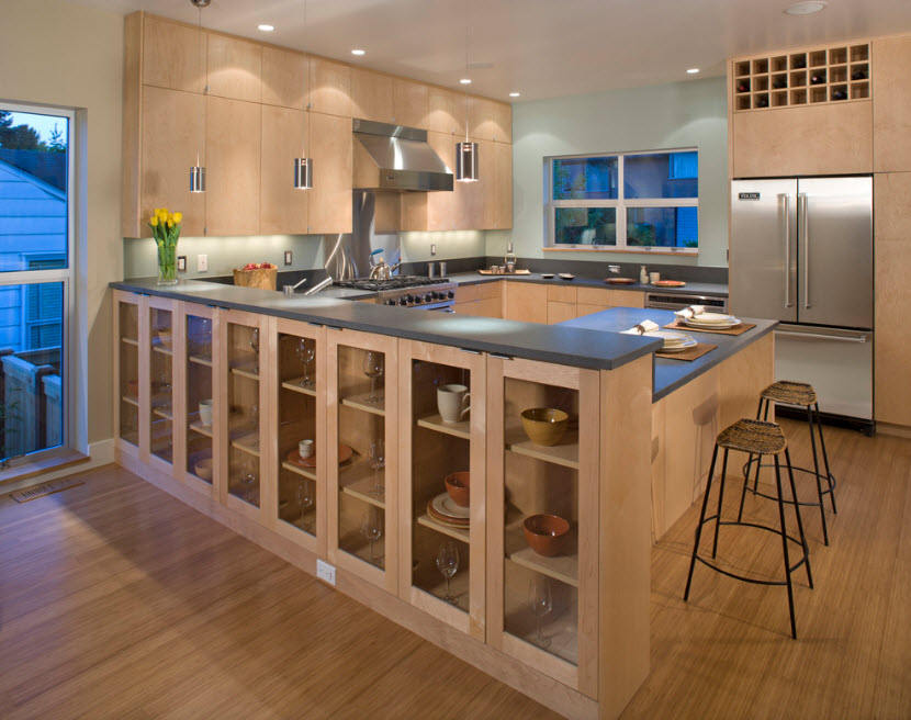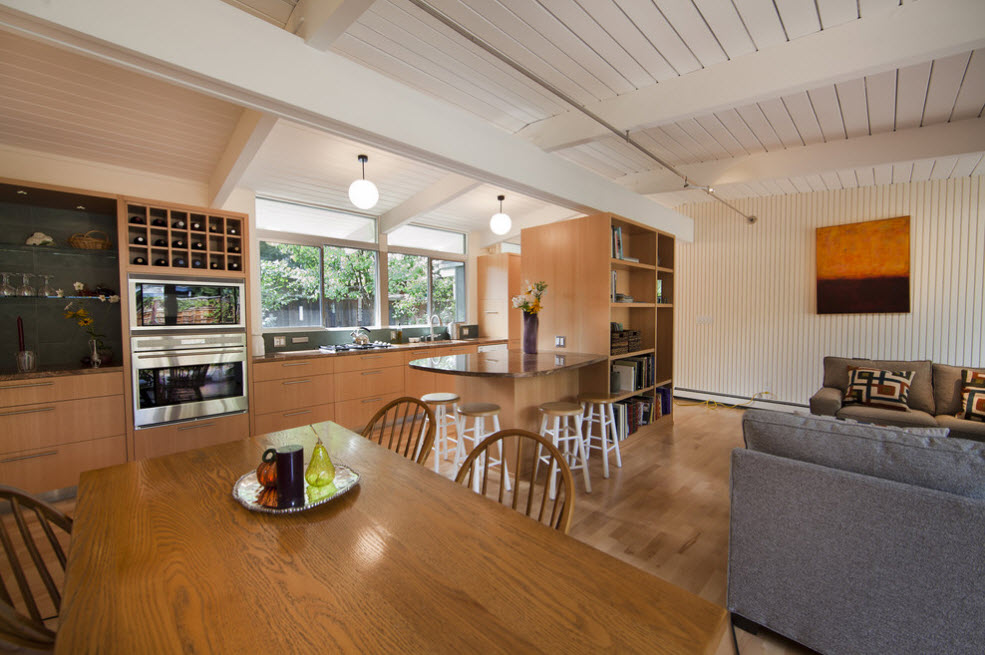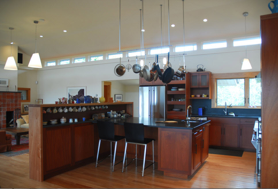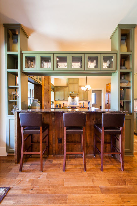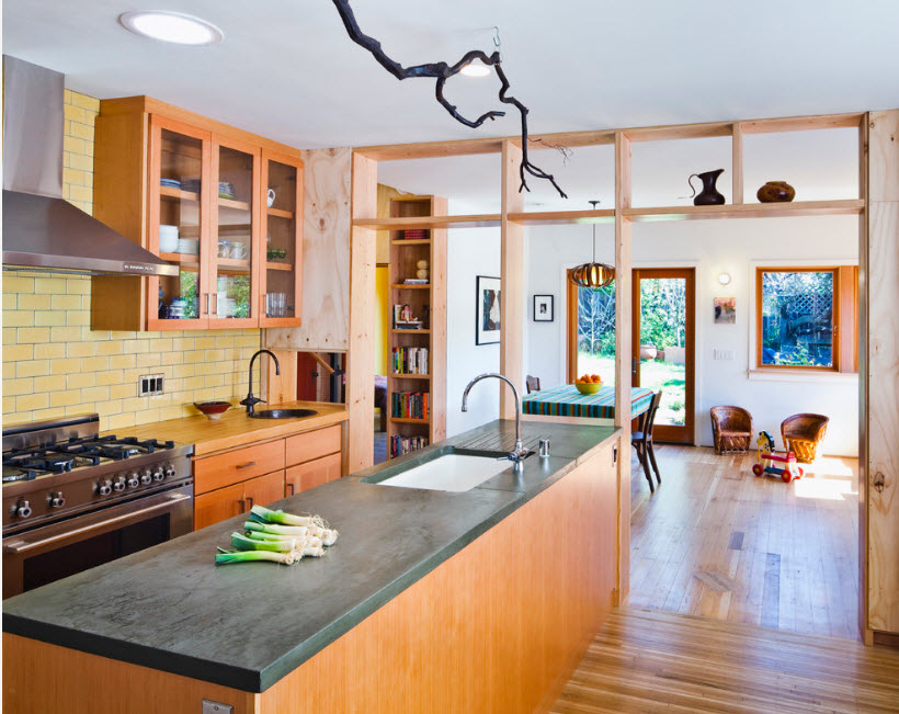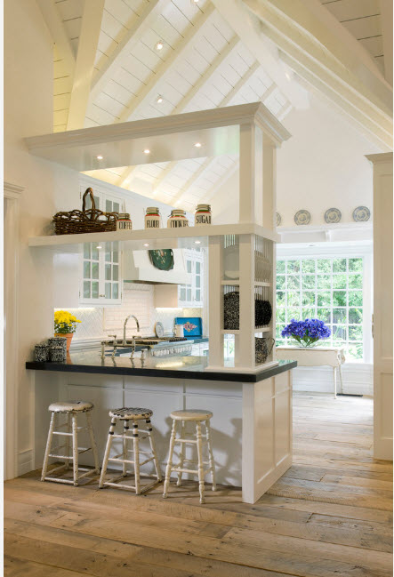 Еще один вариант разделяющей перегородки для кухонной зоны в общем помещении – надстройка стеллажа над полуостровом или барной стойкой. Практичный с точки зрения своего основного предназначения кухонный полуостров становится частью перегородки. Обычно добавление в виде стеллажа сводится к возведению лаконичных открытых полок над столешницей.