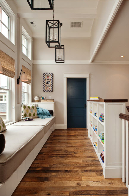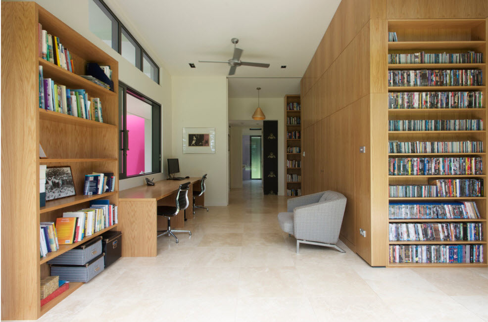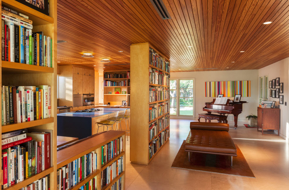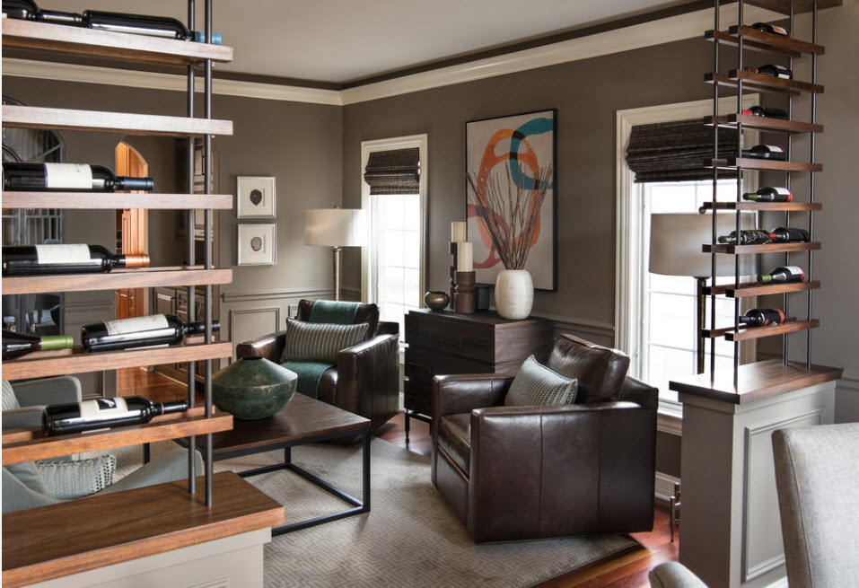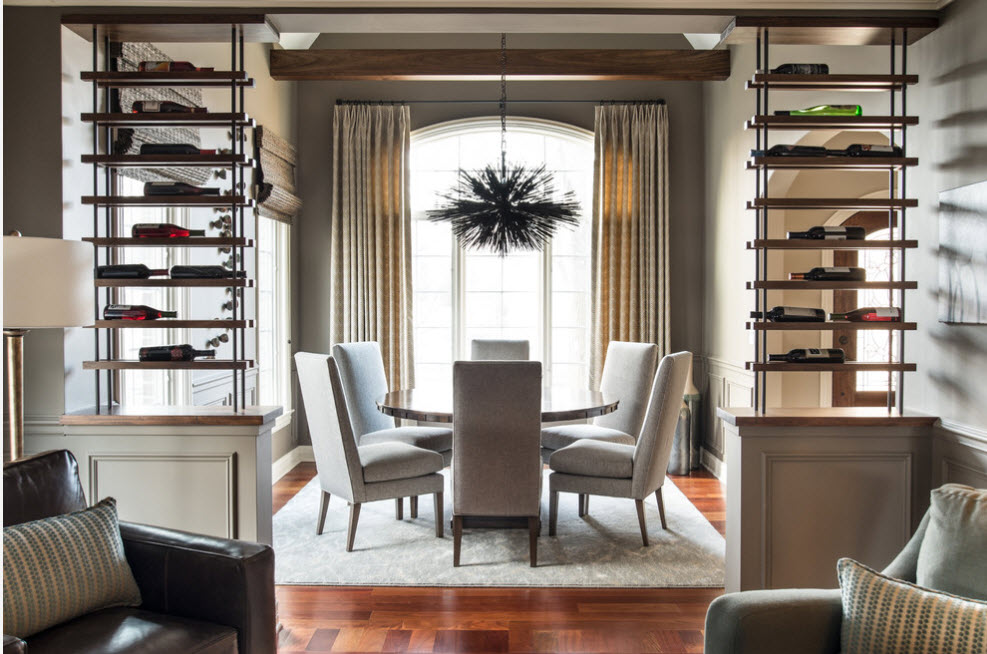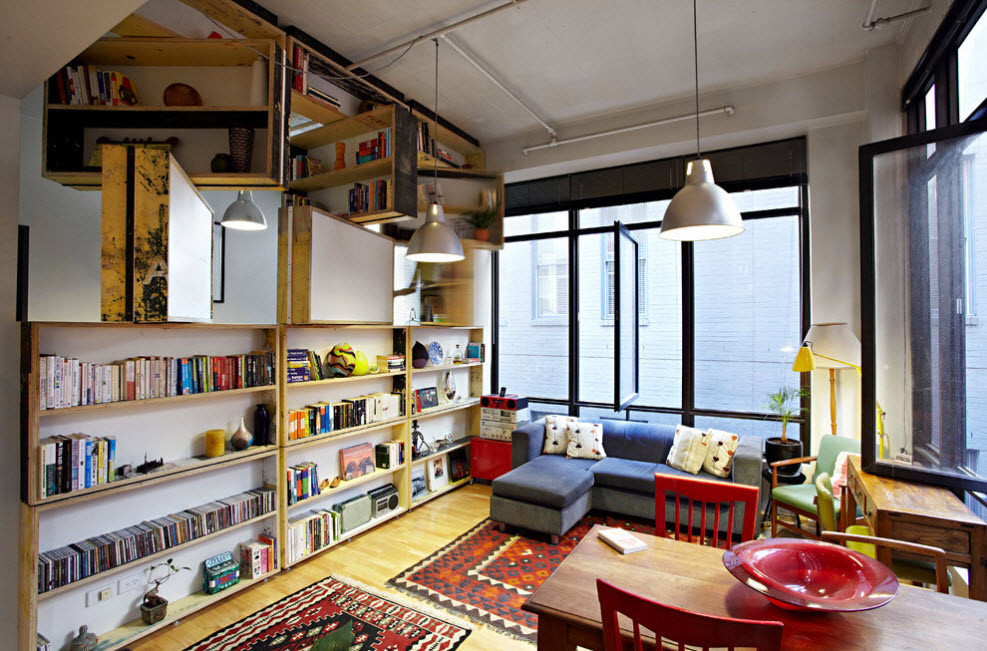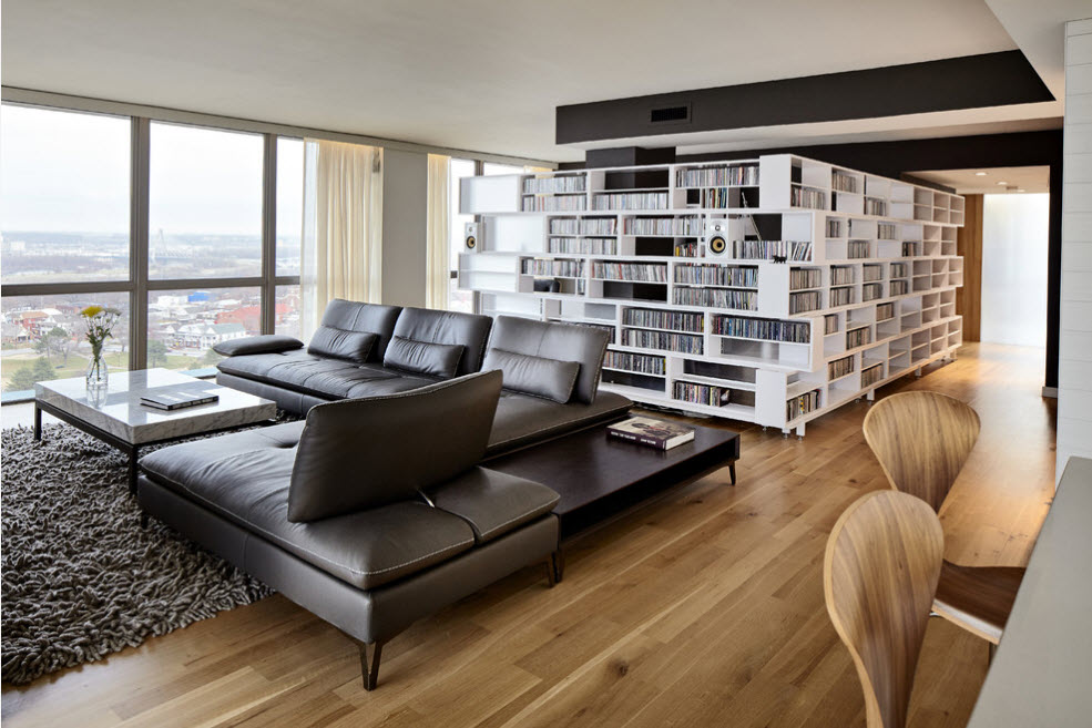 В просторных помещениях стеллажи-перегородки чаще всего нужны для зонирования пространства без использования сплошных стен. Можно и вовсе использовать невысокий стеллаж – иллюзия отделения пространства сохранится, а визуальный объем помещения и количество освещения практически не изменятся. Но в некоторых случаях необходим стеллаж-перегородка от пола и до потолка – такой прием зонирования не станет преградой в просторном помещении с несколькими окнами.