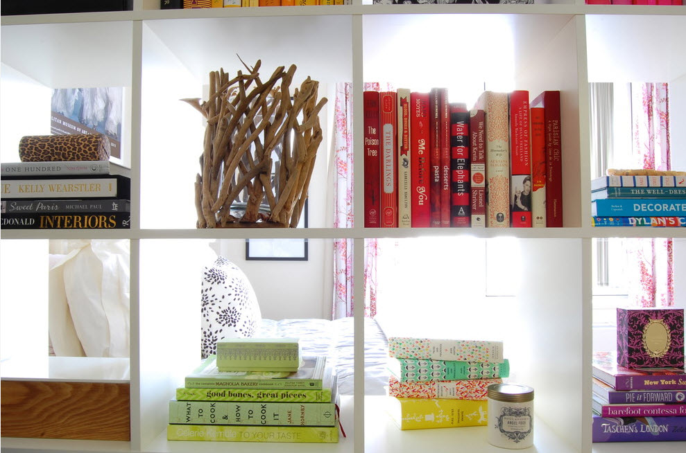 В зависимости от того, в каком помещении используется стеллаж-перегородка и какие функциональные зоны разделяют, зависит и его содержание. Хранение книг – один из наиболее распространенных вариантов наполнения систем хранения в виде стеллажей. Книги нет причин прятать за фасадами, в недрах шкафов или выдвижных ящиков. Красивые корешки книг не только помогут быстро найти нужное произведение, но и украсят интерьер помещения, привнесут цветовое разнообразие в дизайн комнаты с нейтральной палитрой.